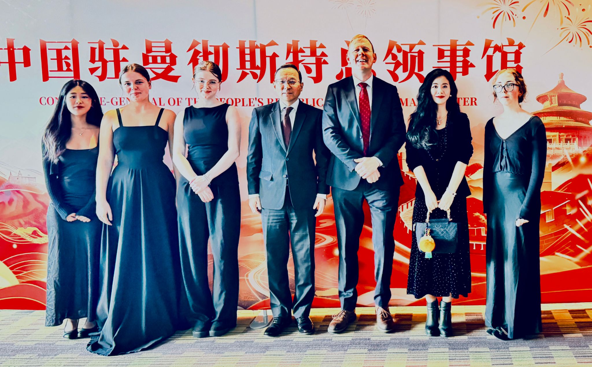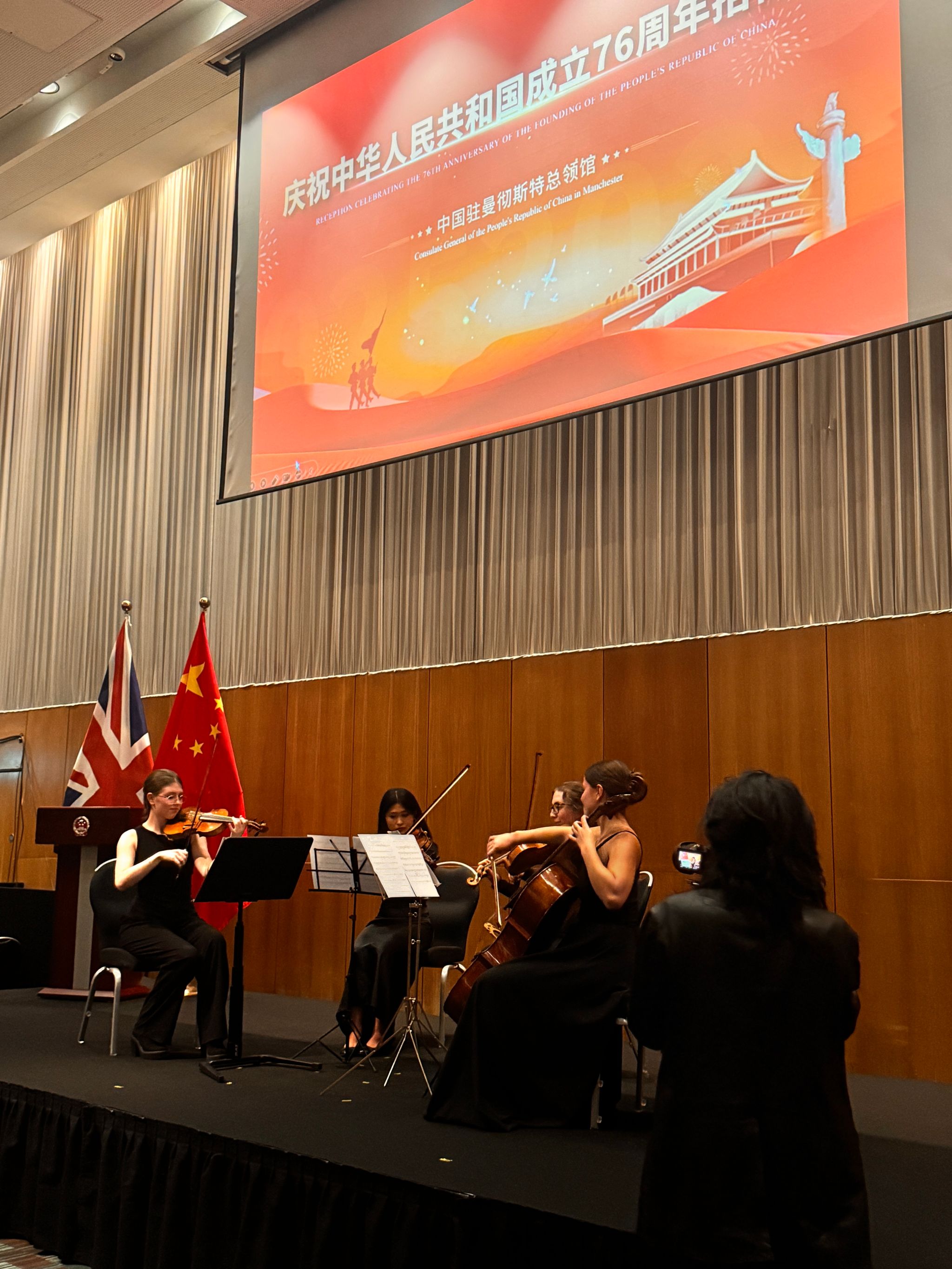 由我校与切特姆音乐学校合作共建的“音乐孔子课堂”英方理事长汤姆·雷蒙德(Tom Redmond)、中方负责人郐毅老师也受邀出席本次活动。受总领馆委托,音乐孔子课堂还特邀作曲家贾如先生,为本次招待会特别创作了以中国传统民族乐曲《花好月圆》为主题的弦乐四重奏作品,并由来自切特姆音乐学校的优秀学生为全体嘉宾现场演绎。中西合璧的曲目编排,喜庆昂扬的旋律在曼城回响,用音乐传递了节日的祝福与友谊,有力烘托了活动主题,成为本次招待会引人注目的艺术亮点,赢得现场嘉宾的一致赞誉。