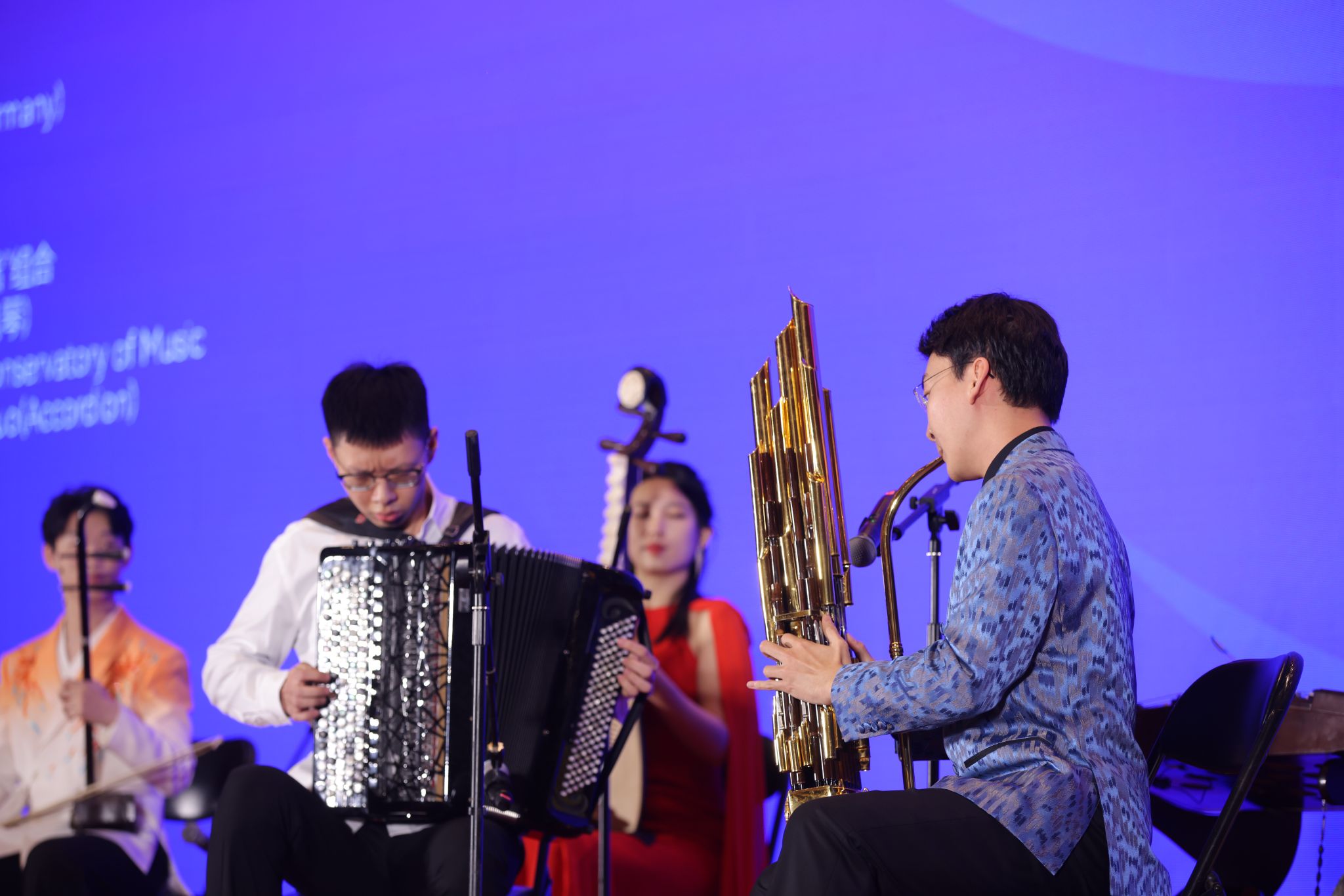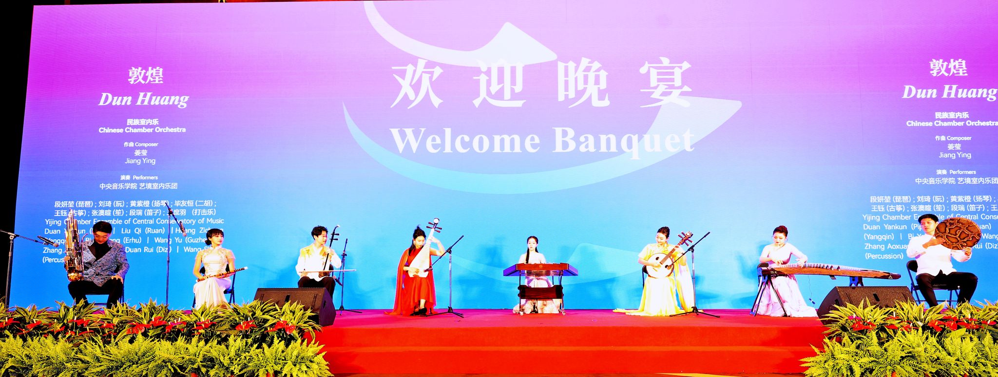 在开幕当天的招待会上,中央音乐学院民乐系博士生段妍堃,硕士生毕友恒、张澳暄、王钰、段瑞、张家宁,本科生黄紫橙、王庶羽,以及钢琴系硕士生张铄为各国嘉宾带来中西乐器对话作品:笙与手风琴《如同你我》和民族室内乐《敦煌》,在各国嘉宾面前弘扬优秀中国音乐文化,展现央音人风采。