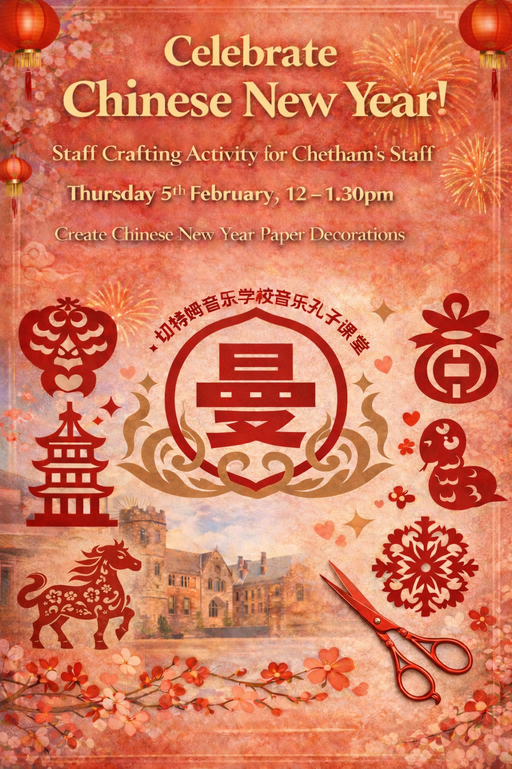 继2026年1月28日切特姆图书馆“中文图书角”启动仪式暨“马年新春文化活动季”揭幕活动之后,音乐孔子课堂于2月5日在切特姆音乐学校举办了第二场“马年新春系列文化活动”——生肖剪纸体验。