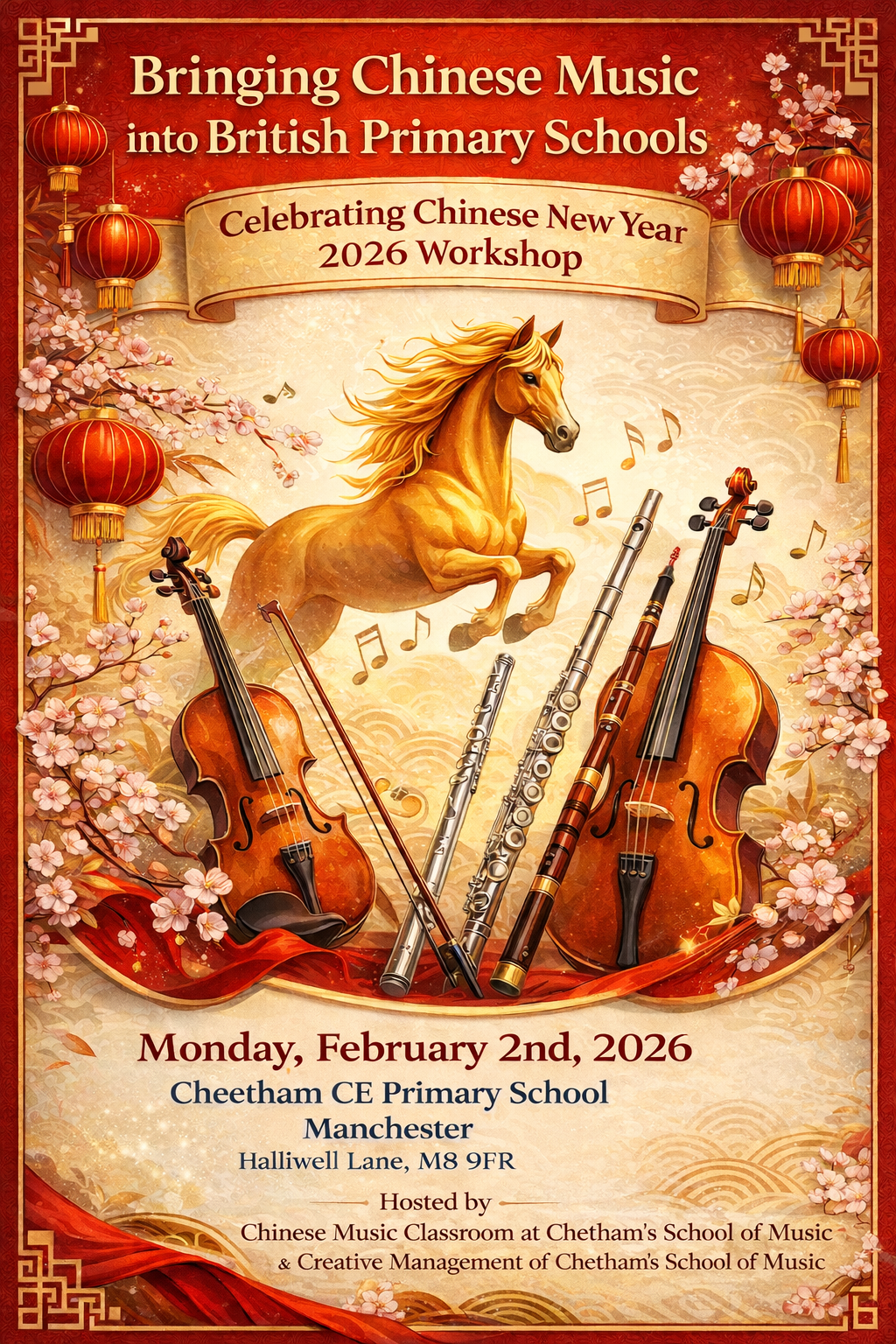 2026年2月2日、4日,由英国切特姆音乐孔子课堂主办、切特姆音乐学校创意部协作开展的“中国音乐进校园”系列文化活动,先后在曼彻斯特地区的奇瑟姆基督教小学(Cheetham CE Primary School)、索尔福德地区的圣菲利普基督教小学(St Philip’s CE Primary School)举办。