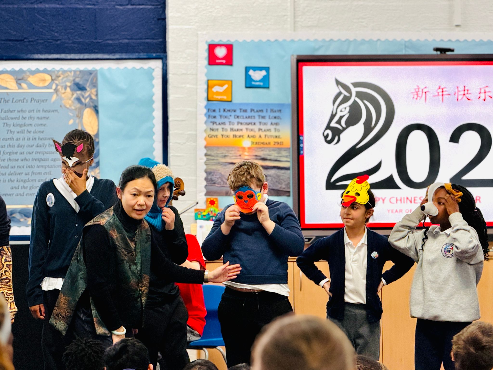 活动以中国新春文化与十二生肖为主线,用音乐描绘的方式展现了“子鼠、丑牛、寅虎、卯兔”等生肖形象,引导学生在聆听、想象与参与中理解中国文化中生肖所承载的象征意义,将动物形象与乐器音色相结合的方式,使抽象的音乐语言转化为孩子们易于理解和感知的“声音故事”。