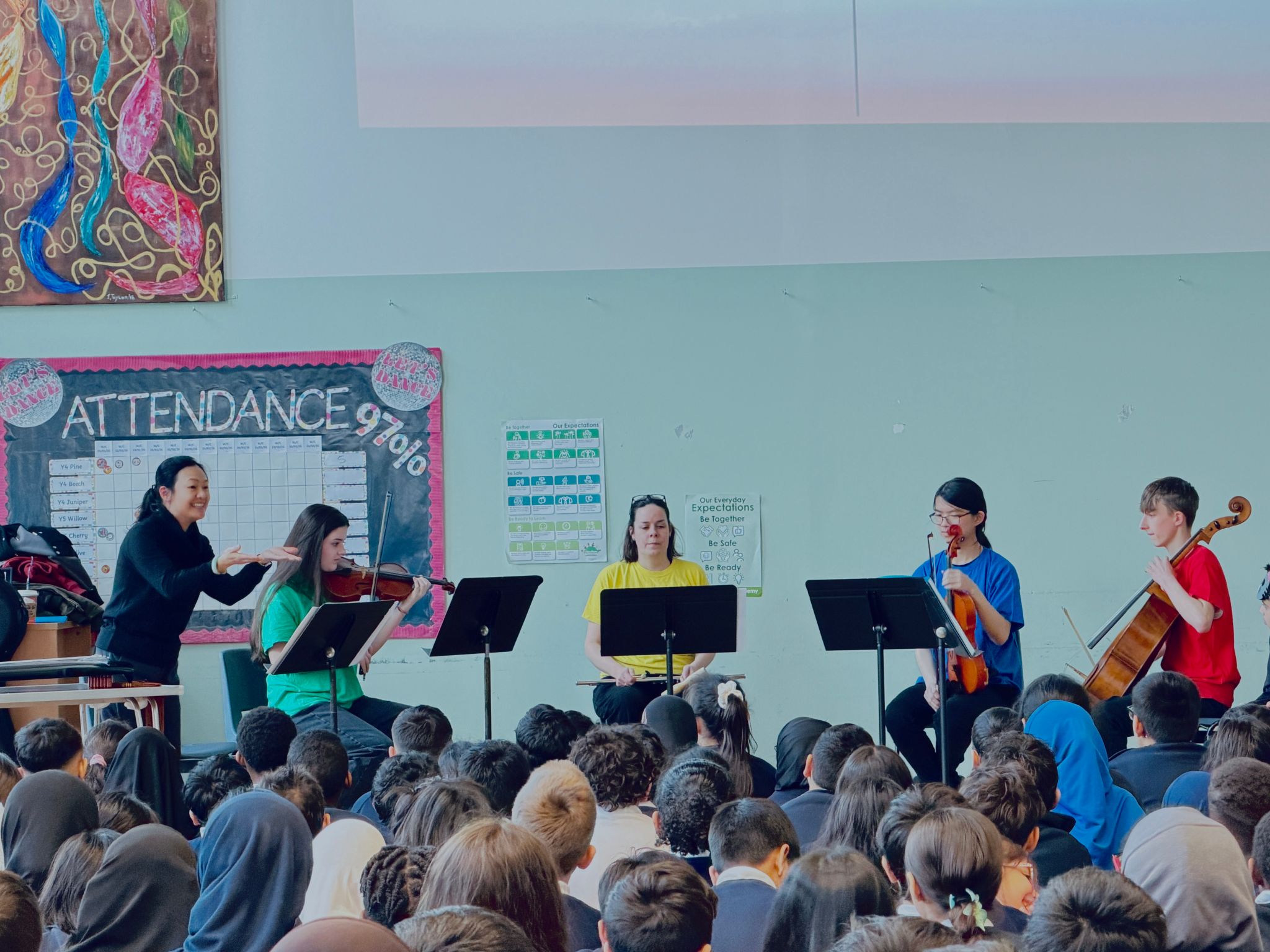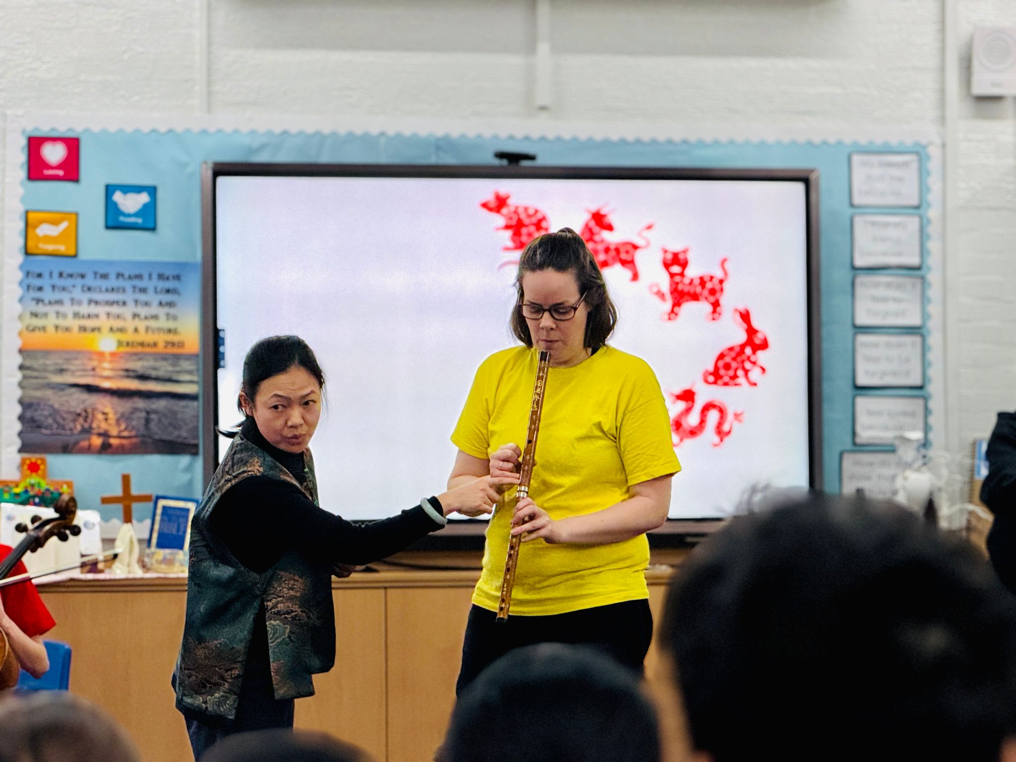 姜谧娅副教授带领学生学习并演唱多首中国传统民歌与童谣,引导孩子们用声音和身体去感受中国音乐的韵律与情感,在轻松愉快的氛围中逐渐建立对中国民歌旋律走向与语言节奏的体验与理解。Sarah Atter 则携切特姆音乐学校小型弦乐队共同参与呈现了演出环节,与中国传统音乐元素形成丰富的中西音乐对话,充分展现了中西音乐在音色、结构与表达方式上的交流与融合。