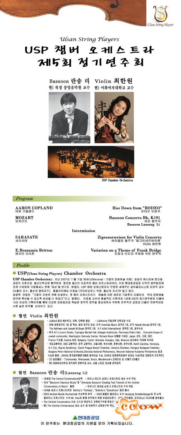 2010年11月22日-26日我院管弦系巴松教授李岚松应邀赴韩国蔚山交响乐团举办个人音乐会,与蔚山交响乐团合作演出了莫扎特协奏曲与降B大调协奏曲。演出获得圆满成功。