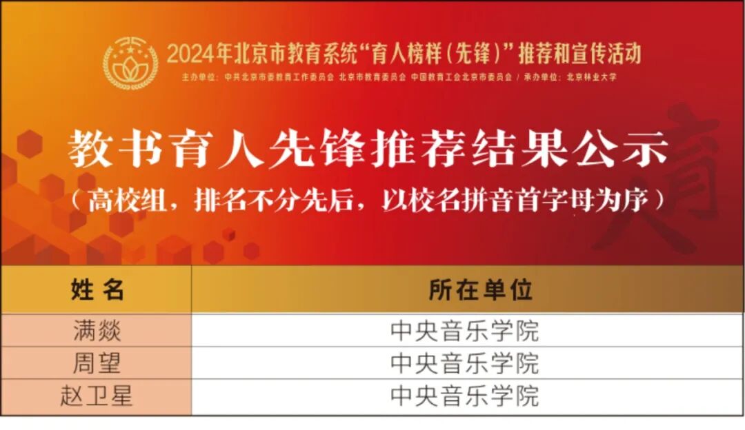 经过相关程序,我校满燚、周望、赵卫星获评“北京市教育系统教书育人先锋”,李昕、何宽钊获评“北京市教育系统管理育人先锋”,陶倩、陈冰(指挥系)获评“北京市教育系统服务育人先锋。
