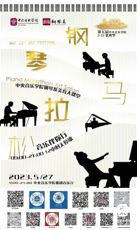 5月27日9点至21点“音乐伴你行·12小时不停歇”钢琴马拉松音乐会在中央音乐学院歌剧音乐厅成功举办。音乐会作为第五届中央音乐学院5.23艺术节钢琴系专场活动,由中央音乐学院院长办公室、中央音乐学院钢琴系及钢琴系党总支联合承办,钢琴系主任韦丹文教授担任艺术总监、主科教研室主任盛原教授、副主任张欣宁教授担任音乐总监。