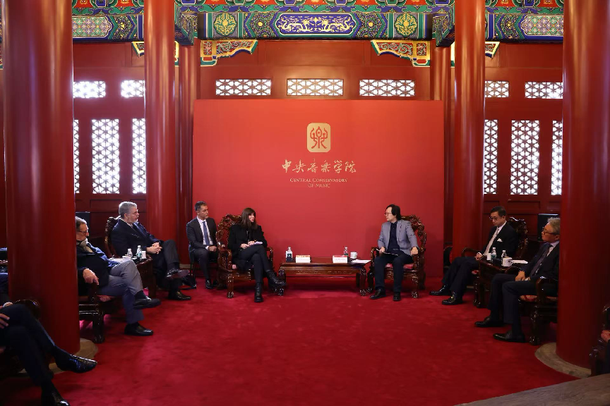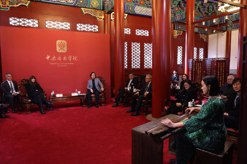 11月14日,意大利大学与研究部部长安娜·玛丽亚·贝尔尼尼女士、意大利驻华大使安博思先生、意大利大学校长联合会主席、国家研究委员会主席、国家高等艺术与音乐教育委员会主席等15位代表到访我校。中央音乐学院副院长秦文琛教授、钢琴系主任韦丹文教授、提琴制作研究中心主任高彤彤教授、音乐人工智能与信息科技系主任李小兵教授与代表团共同出席在学院南大殿举行的欢迎仪式。民乐系赵晓霞教授用唐代古琴“太古遗音”演奏了名曲《流水》,介绍了具有1400年历史的“太古遗音”古琴的由来以及《流水》所蕴含的“高山流水遇知音”的美好寓意。