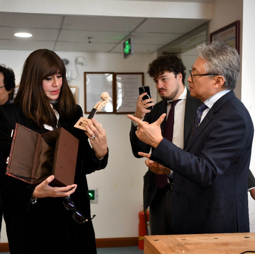 我校提琴制作研究中心依托六十余年的历史积淀,以创新的教学模式和开阔的国际视野,成为中国提琴制作的领军力量。贝尔尼尼与正在中心交换学习的意大利学生亲切交谈,并欣喜地接受了一份独特的礼物——我校学生雕刻制作的小提琴琴头。