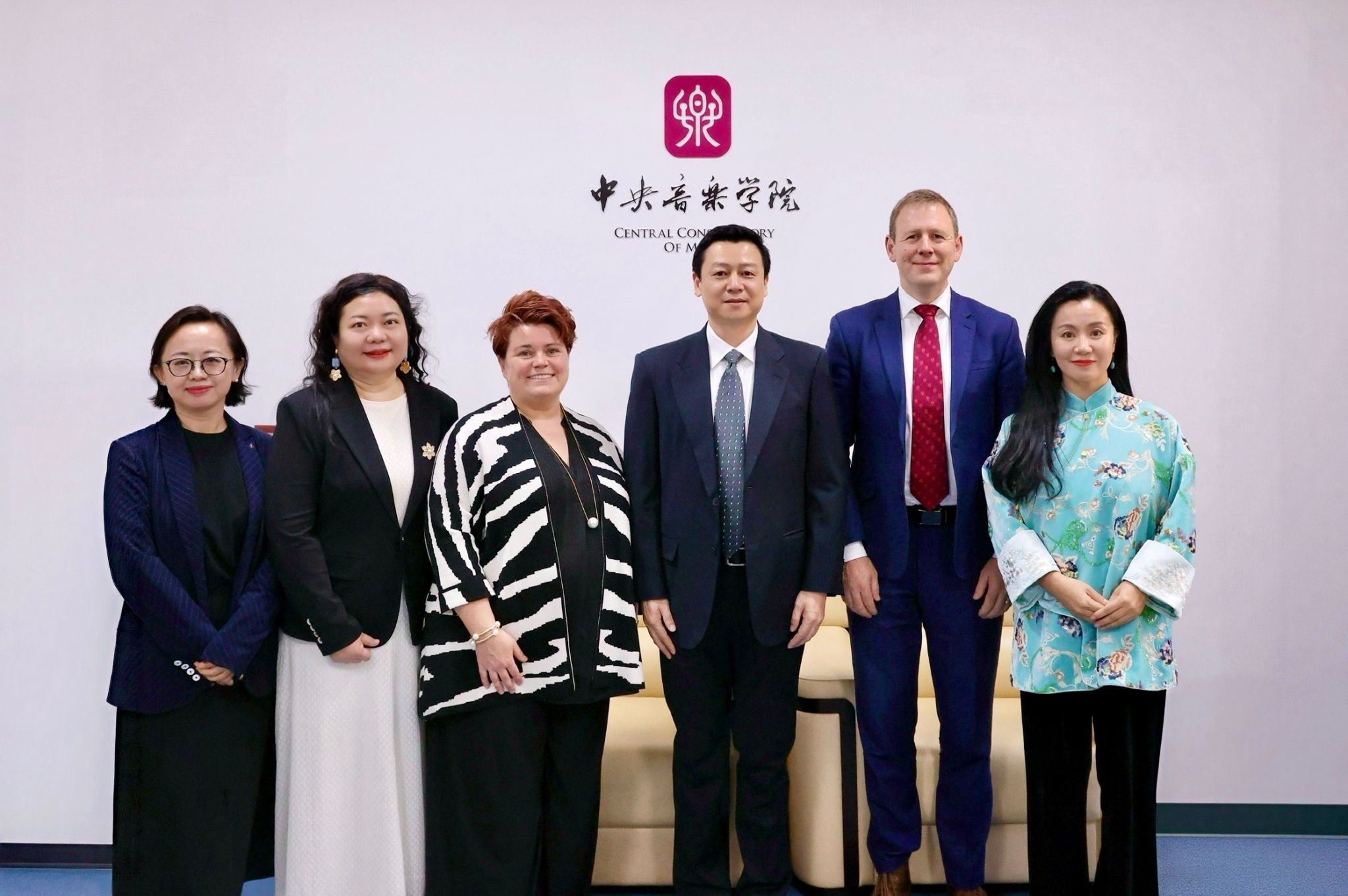 11月25日下午,中央音乐学院党委书记沈国华会见了切特姆音乐学校联合校长汤姆·雷蒙德先生、尼古拉·史密斯女士,音乐孔子课堂中方负责人郐毅、音乐孔子学院办公室主任樊薇等陪同会见。沈国华书记对英方师生的到访表示诚挚欢迎,他指出:音乐是跨越国界的语言,相信由两校共建的音乐孔子课堂必将成为推动中英两国青少年相知相亲的艺术桥梁,有力促进双方的理解与交流。两位英方校长高度肯定音乐孔子课堂的价值,认为其带来的博大精深中国音乐文化,不仅为该校的教学注入了多元活力,更丰富了师生们的精神生活。