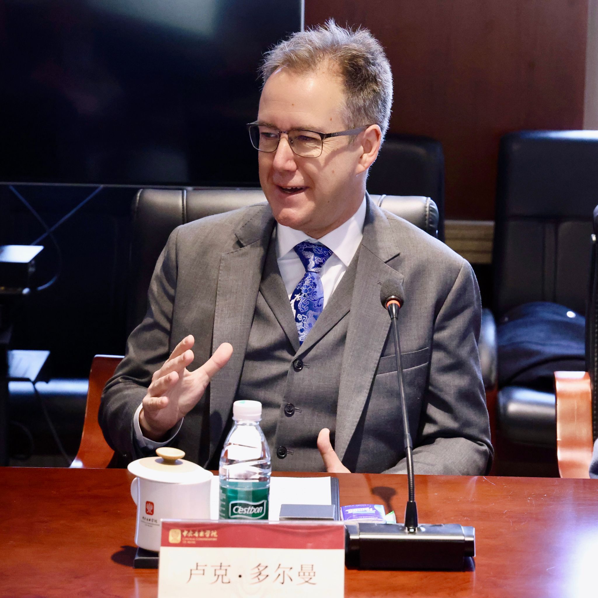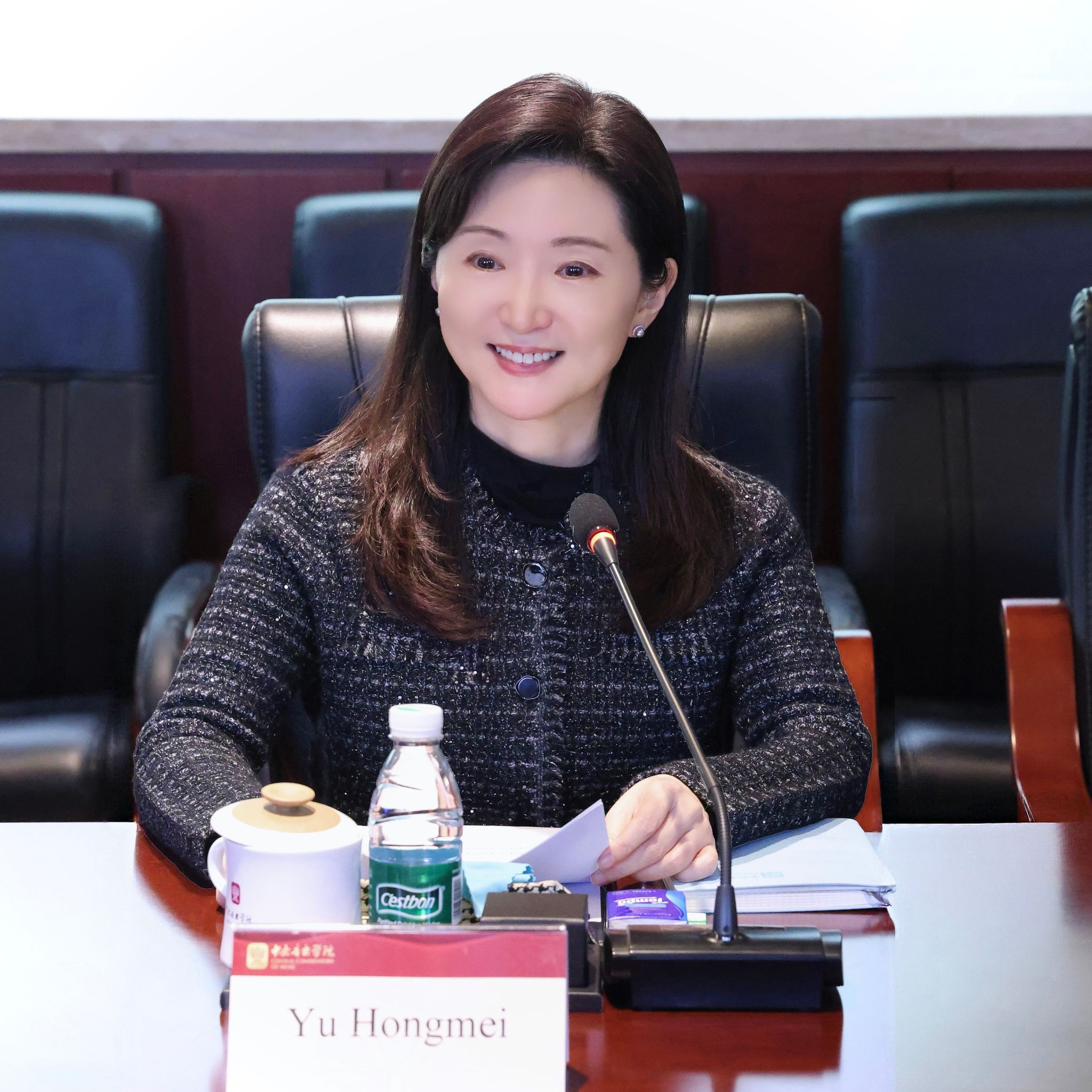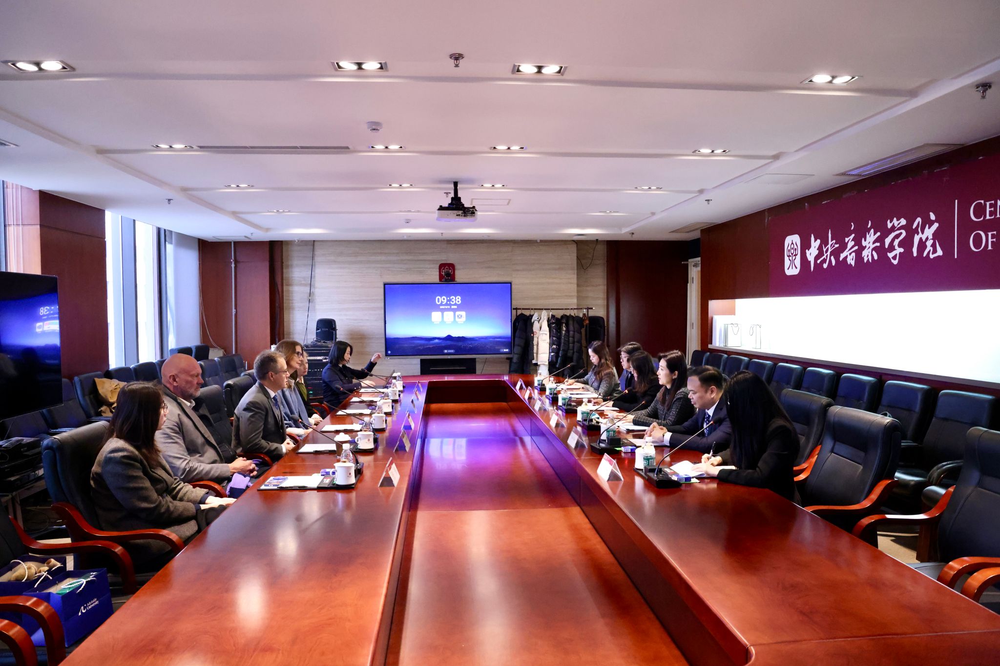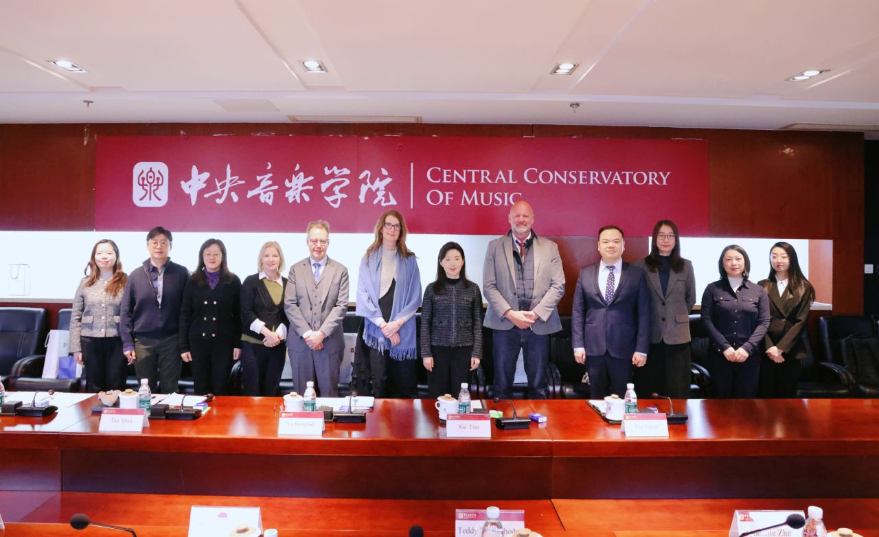 12月12日,中央音乐学院院长于红梅在学校会见澳大利亚阿德莱德大学国际事务与对外合作院长卢克·多尔曼教授、埃尔德音乐学院院长安娜·戈德斯沃西教授、古典音乐表演系主任伊丽莎白·雷顿博士、声乐系主任泰迪·塔胡·罗德斯先生等一行。
