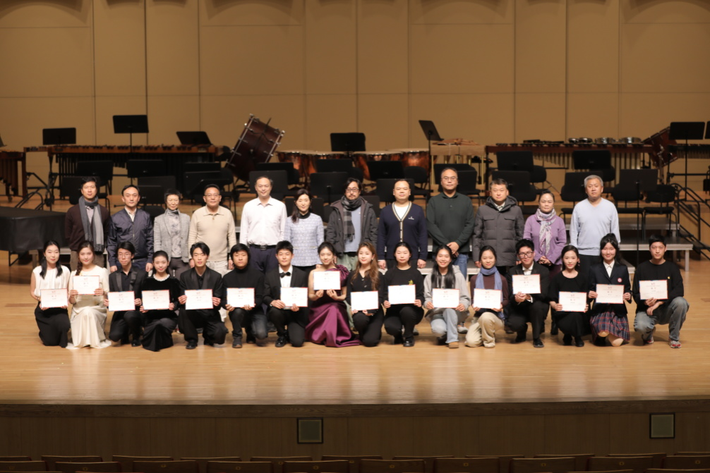 音乐会结束后,于红梅校长公布入选学生名单,与柯扬副校长一同为入选同学颁发证书。评委和入选同学合影留念。