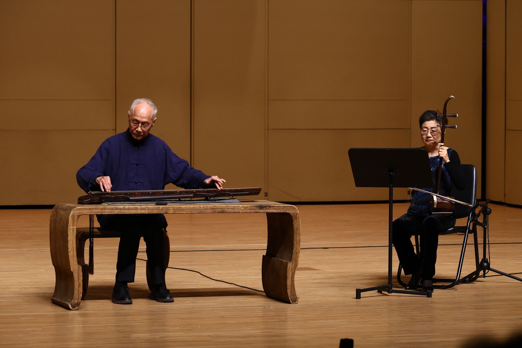 吴钊先生作为查阜西先生的亲传弟子,与我校二胡专业严洁敏教授合作演绎《鸥鹭忘机》,致敬查阜西先生、蒋风之先生的名家风骨。章怡雯副教授弹唱的《苏武思君》延续了查氏琴歌的韵腔传统,歌声与琴音融为一体,情感真挚动人。李凤云教授的古琴独奏《长门怨》,以细腻的音韵处理诠释查阜西先生打谱版本的艺术风格;在琴箫合奏《暗香》中,她与王建欣教授默契配合,琴与箫相互映衬,呈现姜夔词中清雅隐逸的意境。赵家珍教授则携明琴登台,演奏查阜西先生打谱的《潇湘水云》,以丝弦独有的古朴韵味生动再现 “查潇湘” 之神韵,表达对查先生的一份深切礼敬。