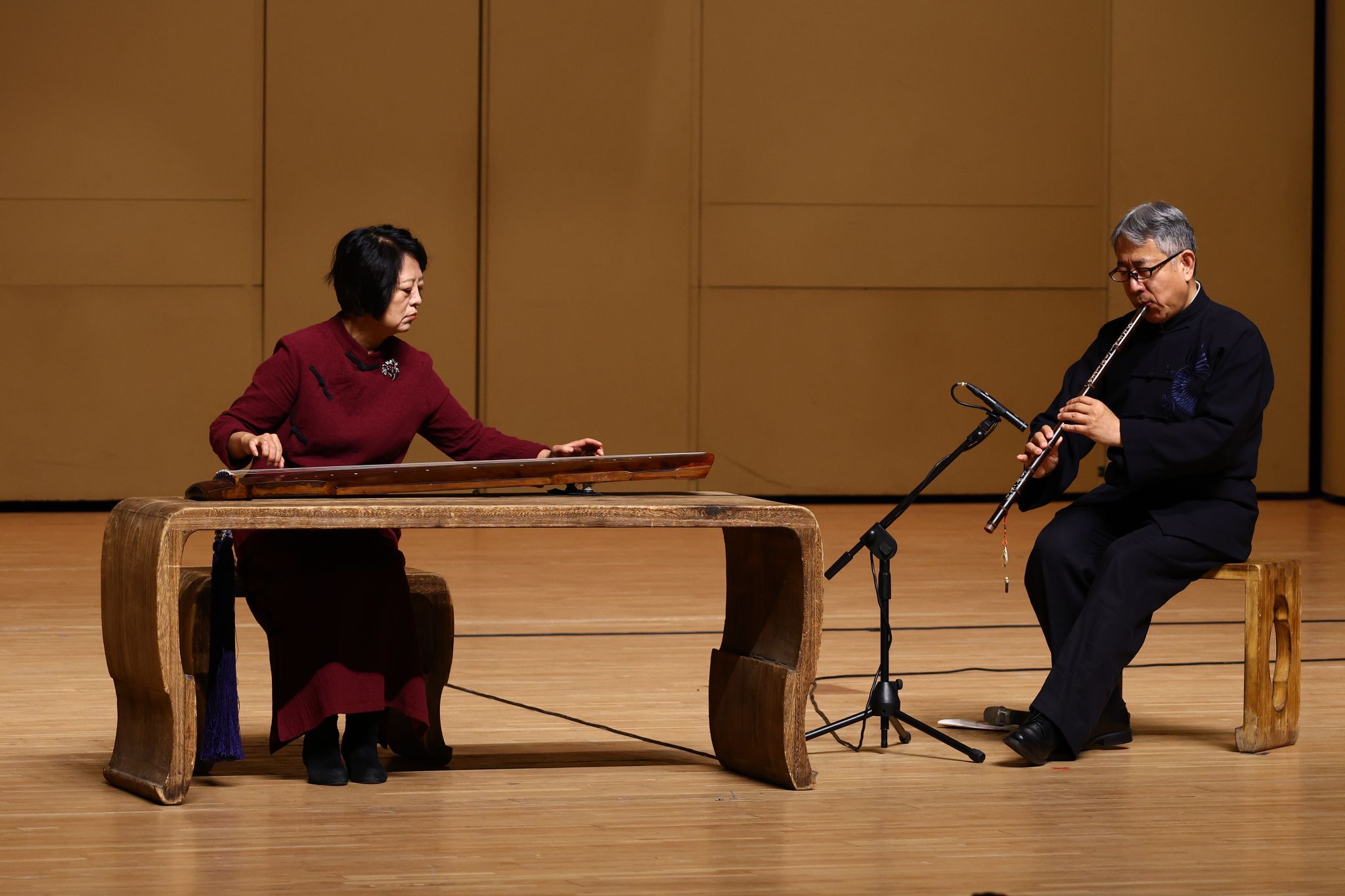 音乐会既包含古琴独奏、琴歌、琴箫等多种经典演奏形式,同时积极探索当代的表达维度。赵晓霞教授带领学生率先登台演绎古琴重奏《古怨》。该作品以姜夔的琴歌为灵感源泉,以琴、歌、箫、鼓等多重形式的结合,拓展了琴乐的织体层次与音响维度。
