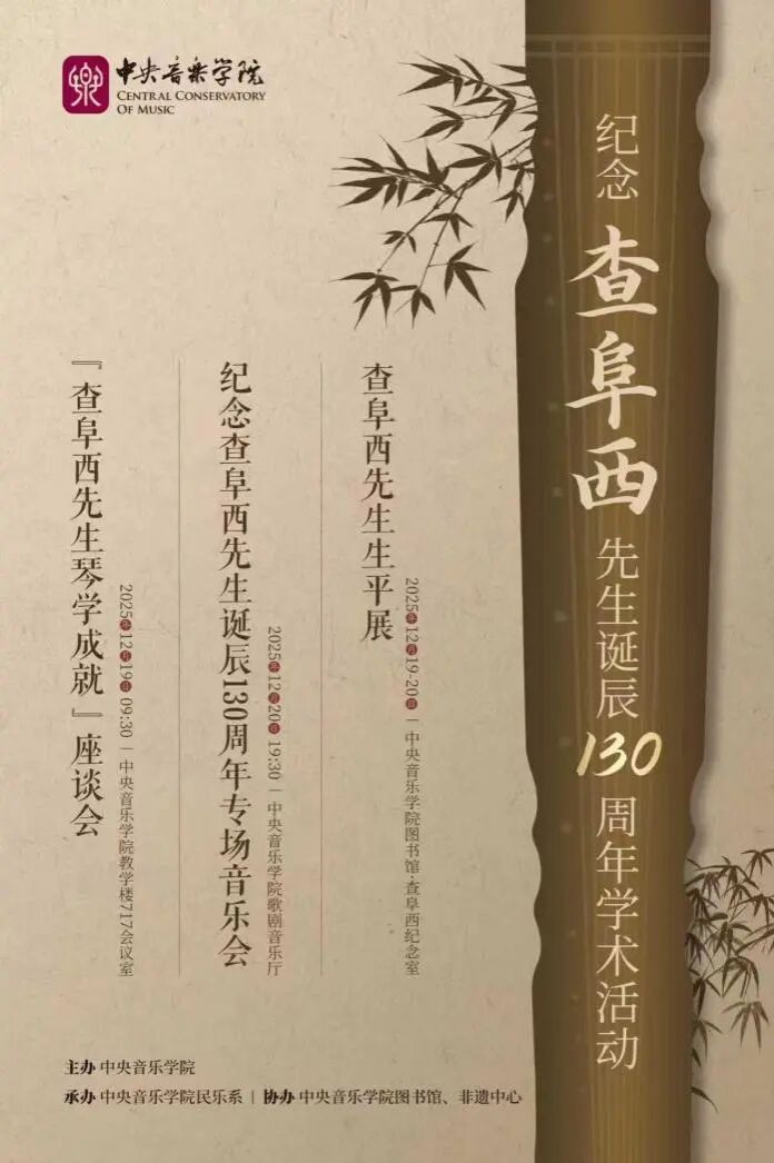 2025年恰逢查阜西先生诞辰130周年,由中央音乐学院主办,民乐系承办,图书馆、非遗中心协办的“纪念查阜西先生诞辰130周年学术活动”,于12月19日至20日在中央音乐学院隆重举行。活动包括座谈会、查阜西先生生平展、专场音乐会等环节,汇聚海内外琴界学者与学术同仁,共同追忆先生风范,共话古琴艺术的当代发展。
