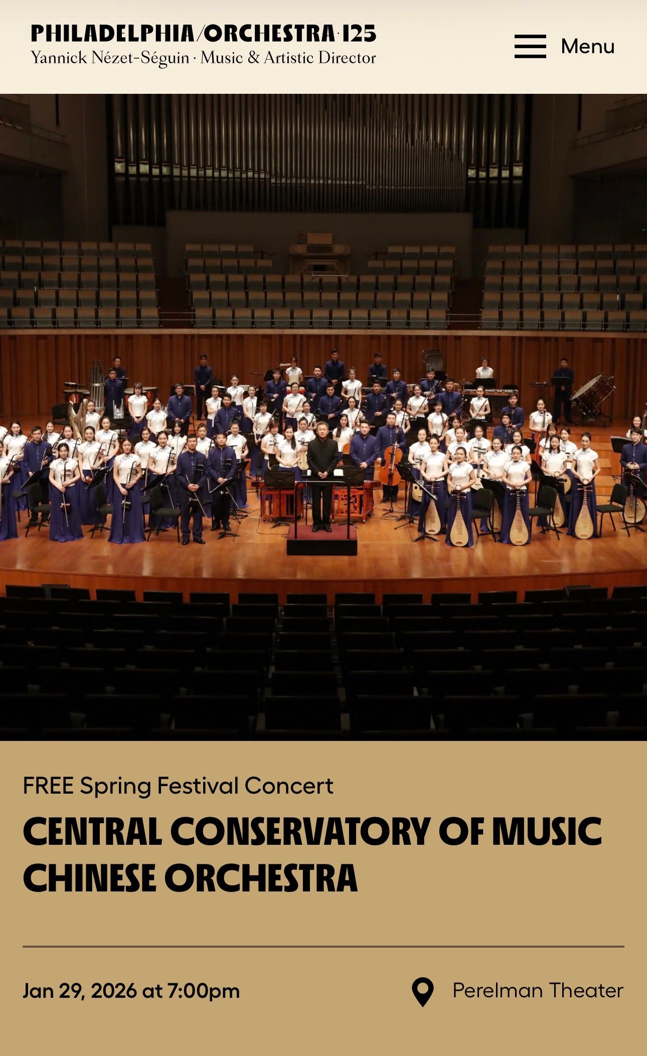 上述两场音乐会作为文化和旅游部2026年在美国“欢乐春节”和“你好!中国”旅游形象推广品牌的重要活动,第一场“中美新年音乐会”隶属于费城交响乐团近年来打造的重要品牌“欢乐春节”系列;第二场为“中央音乐学院民乐专场音乐会”,由央音选派的40余名优秀演奏家参演。