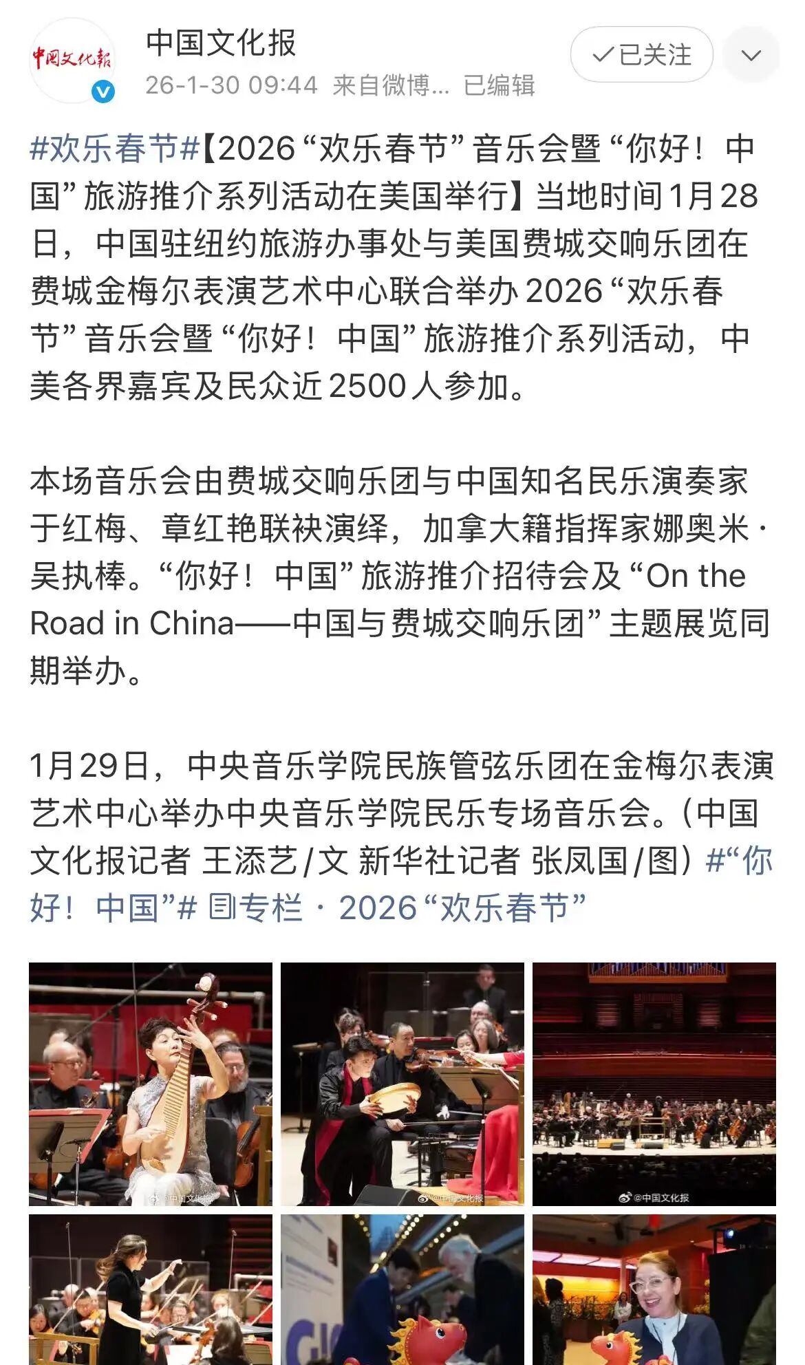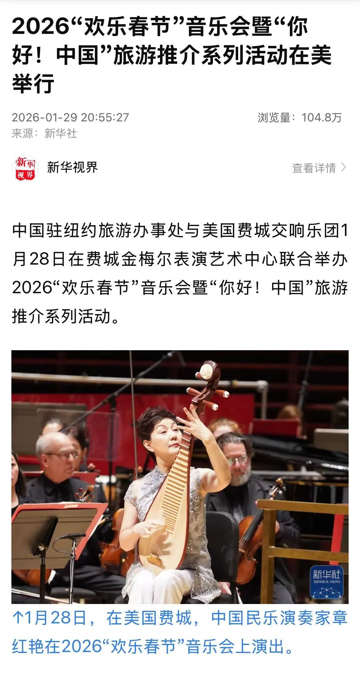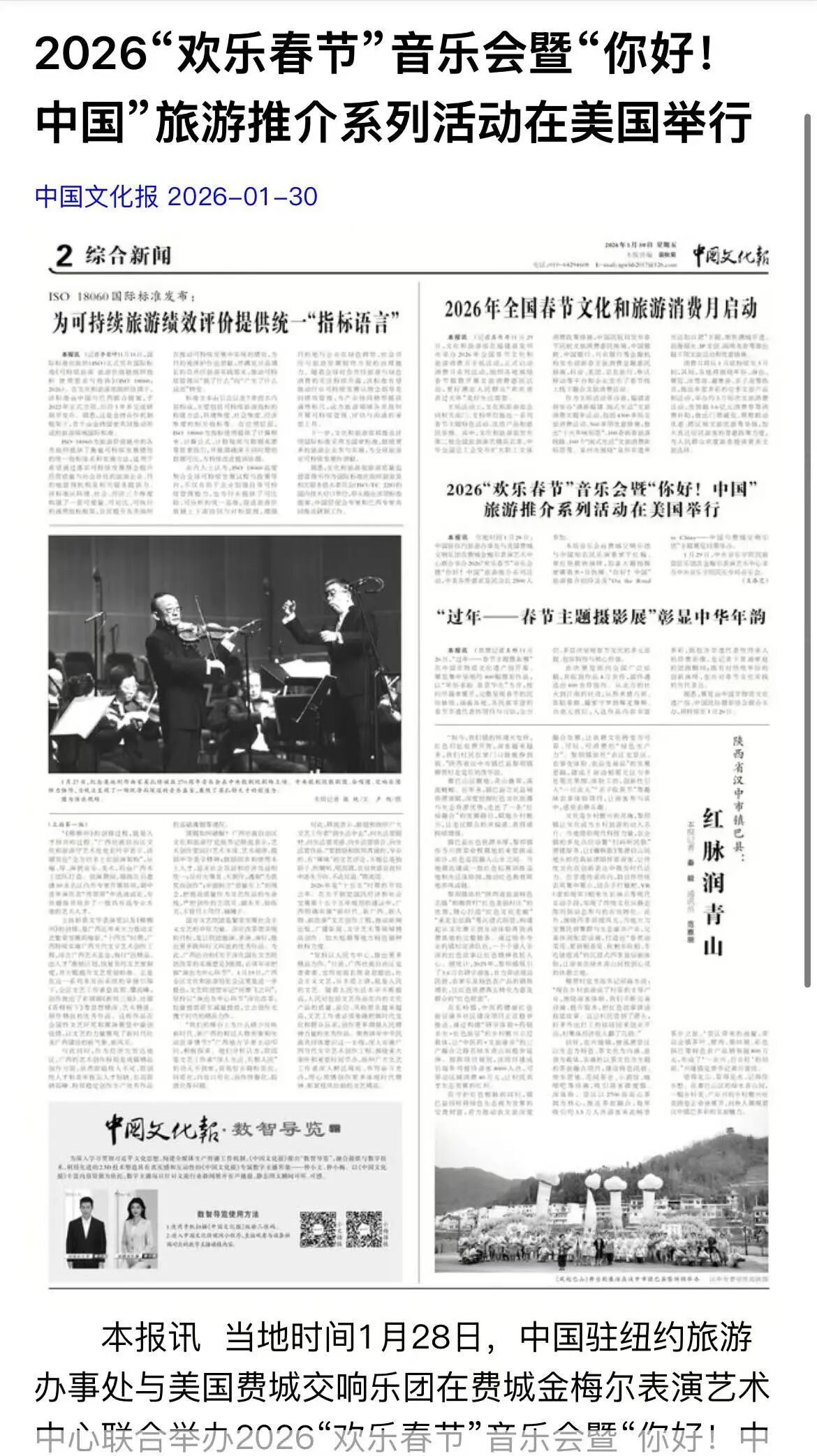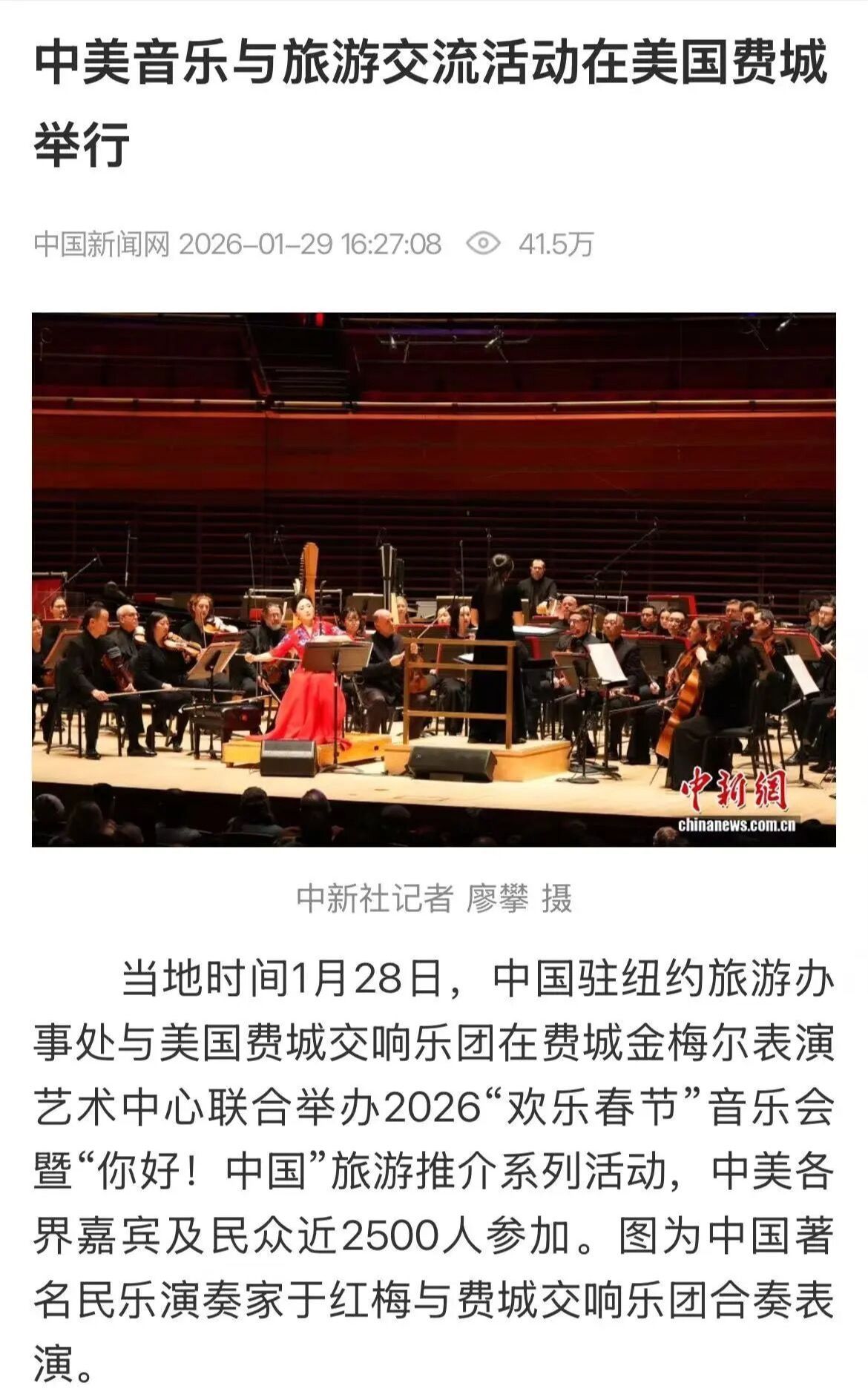 当地时间1月28日,美国费城金梅尔表演艺术中心张灯结彩、暖意融融。中国驻纽约旅游办事处与美国费城交响乐团在此联合举办2026“欢乐春节”音乐会暨“你好!中国”旅游推介系列活动。当晚19:30,作为此次系列活动的核心内容,此次“欢乐春节”音乐会由费城交响乐团携手中央音乐学院院长、著名二胡演奏家于红梅教授,著名琵琶演奏家章红艳教授,在玛丽·安德森音乐厅联袂呈现。中国驻美国大使谢锋及夫人王丹,中国驻纽约总领事陈立,费城交响乐团总裁、CEO睿恩德·弗勒(Ryan Fleur),美国巴德美中音乐研习院院长蔡金冬、作曲家周龙等嘉宾,同美国政界、文化界、旅游界代表及当地民众2500余人齐聚一堂,在东西方乐曲的和谐奏鸣中,共迎新春。活动受到新华社、Xinhua News、“学习强国”学习平台、新华网、中新网、《人民日报海外版》、《中国文化报》《中国艺术报》等众多主流媒体关注报道。