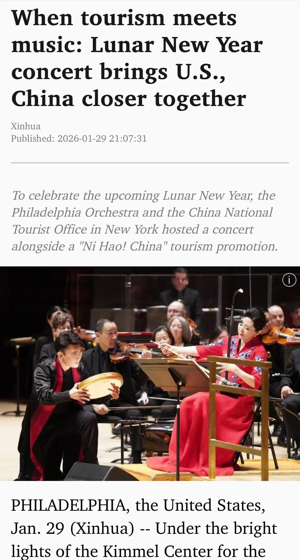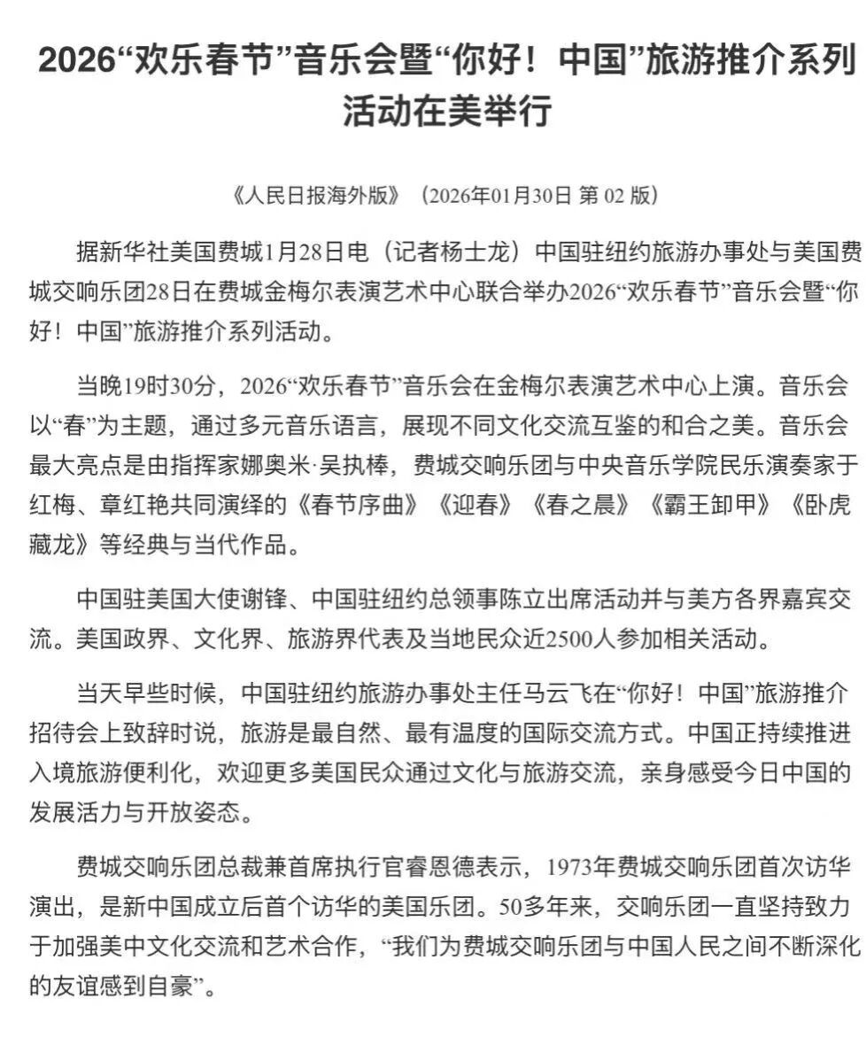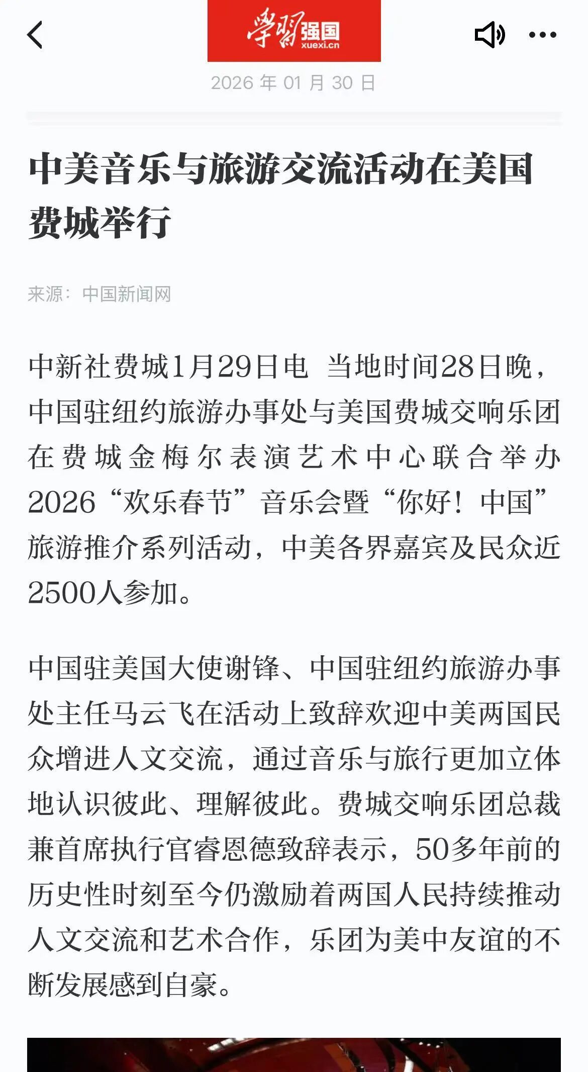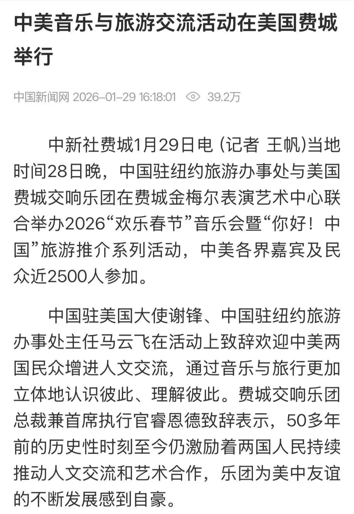 当地时间1月28日,美国费城金梅尔表演艺术中心张灯结彩、暖意融融。中国驻纽约旅游办事处与美国费城交响乐团在此联合举办2026“欢乐春节”音乐会暨“你好!中国”旅游推介系列活动。当晚19:30,作为此次系列活动的核心内容,此次“欢乐春节”音乐会由费城交响乐团携手中央音乐学院院长、著名二胡演奏家于红梅教授,著名琵琶演奏家章红艳教授,在玛丽·安德森音乐厅联袂呈现。中国驻美国大使谢锋及夫人王丹,中国驻纽约总领事陈立,费城交响乐团总裁、CEO睿恩德·弗勒(Ryan Fleur),美国巴德美中音乐研习院院长蔡金冬、作曲家周龙等嘉宾,同美国政界、文化界、旅游界代表及当地民众2500余人齐聚一堂,在东西方乐曲的和谐奏鸣中,共迎新春。活动受到新华社、Xinhua News、“学习强国”学习平台、新华网、中新网、《人民日报海外版》、《中国文化报》《中国艺术报》等众多主流媒体关注报道。