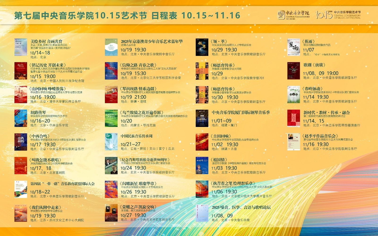 在习近平总书记主持召开文艺工作座谈会并发表重要讲话11周年之际,“以史为脉,以乐为桥——第七届中央音乐学院10·15艺术节”将于10月15日—11月16日在北京、上海、厦门、昆明等地同步拉开帷幕,以为期一个月的丰富活动奏响“艺术为民”的锦绣华章。艺术节由教育部体卫艺司、北京市委教育工委、北京市委宣传部、北京市教委指导,由文化和旅游部艺术司、中央音乐学院、中共云南省委宣传部、厦门市委市政府联合主办。