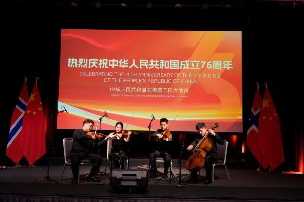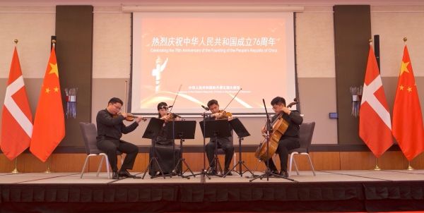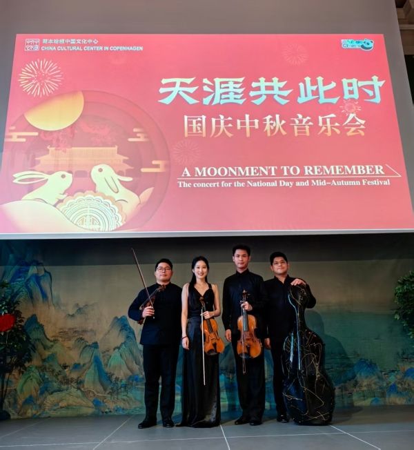 为庆祝中华人民共和国成立76周年和2025中秋佳节,文化和旅游部邀请并委派经我校管弦系推荐的麦天龙、李京灿、王哲风和冯赫四位博士生组成的龙吟四重奏于9月27日至10月3日期间赴外参加中国驻挪威大使馆、中国驻丹麦大使馆举办的国庆中秋招待会,并在哥本哈根中国文化中心举行“天涯共此时”国庆中秋音乐会。龙吟四重奏圆满出色地完成了此次任务,在当地引起热烈反响。同时,应挪威音乐学院和丹麦皇家音乐学院的邀请,由国际交流处交流与合作科科长柴扉带队,四重奏成员出席了文化交流活动,旨在加强我校与北欧国家高等音乐院校的交流合作与友好往来。