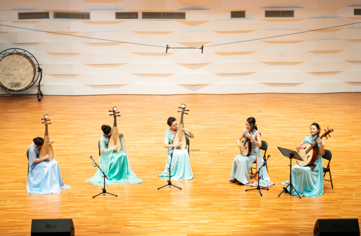 青年琵琶演奏家刘小菁、齐洁和于源春与青年中阮演奏家邸琳、优秀学生张家宁联袂带来《彝族舞曲》。作为琵琶独奏的经典曲目,这首作品因海菜腔旋律和烟盒舞节奏的运用而具有极高辨识度,中阮的加入更为音响增添了立体感和厚重感,形成了绝妙的音响张力与色彩对比,让观众感受到浓厚的彝族文化风情。