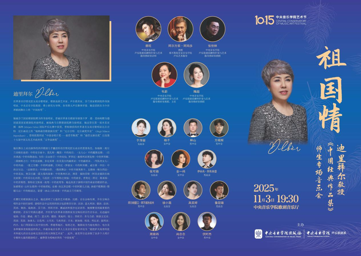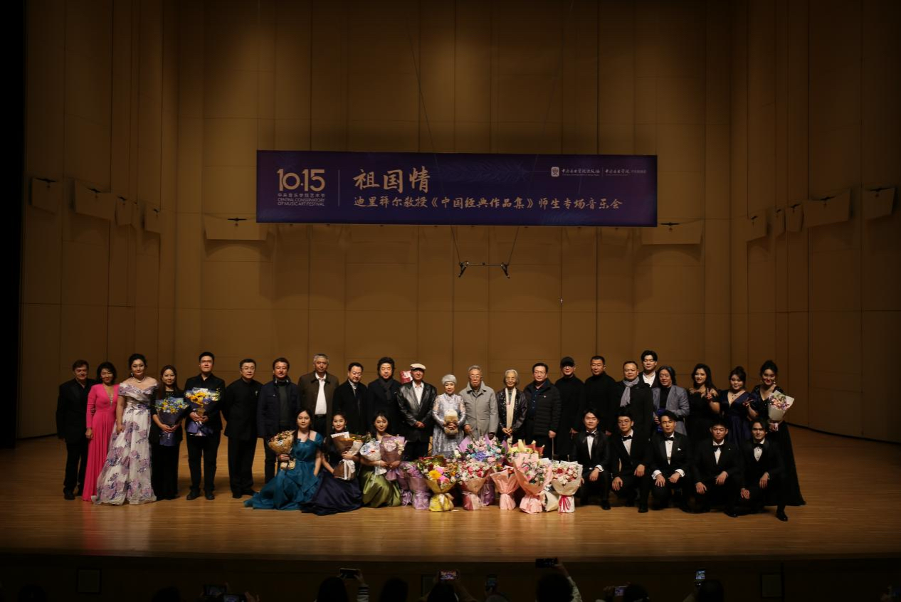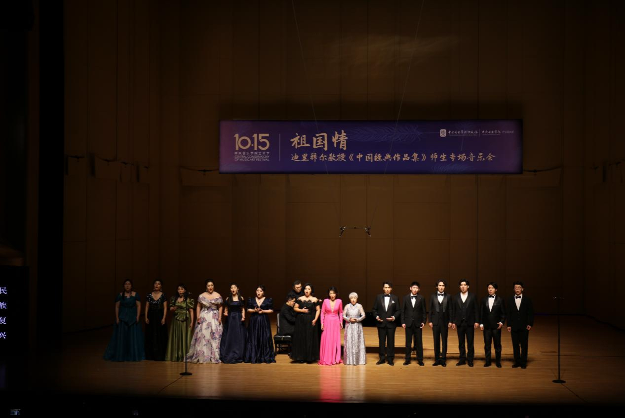 近日,中央音乐学院出版社与声乐歌剧系联合推出的“祖国情”迪里拜尔教授师生音乐会在全校师生及各界友人的热切期盼中成功举办。这场音乐会以图书《中国经典作品集》为脉络,既是一次对经典佳作高水平的艺术呈现,更是一场深沉厚重的爱国情怀传递——从游子对故土的思念到对江山如画的赞颂,从歌剧经典的匠心传承到民族复兴的豪情壮志,友情、故乡情、民族情、祖国情共生共燃。迪里拜尔教授携优秀学生与艺术指导教师一起,用赤诚饱满的情感与匠心独运的诠释,为听众呈现了一场融合了人文厚度与情感温度的音乐之旅。