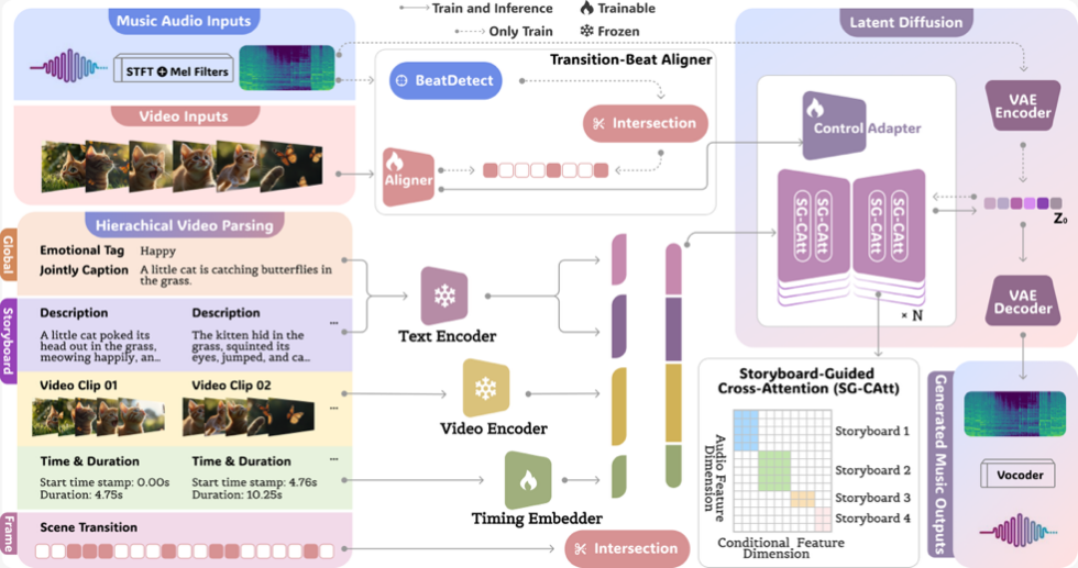 为了解决上述难题,中央音乐学院、北京通用人工智能研究院与阿里巴巴集团联合团队提出了视频配乐生成框架VeM(Video Echoed in Music)。该框架首次将多层级视频解析结果作为音乐生成的“指挥”,在潜空间扩散模型中融合全局语义、分镜级时间信息及帧级场景转场,通过分镜引导跨注意力机制(SG-CAtt)精确实现语义与时间双对齐,并结合转场-节拍对齐器与适配器(TB-As)在帧级实现场景切换与节拍事件的精准同步,从而同时满足视频配乐的情绪契合度与节奏精度。在模型训练过程中,团队构建了专为转场-节拍同步设计的高质量视频音乐数据集TB-Match,并引入了适配该任务的全新节奏对齐评测指标,使生成与评价环节在时间与节奏特性上形成闭环优化。
