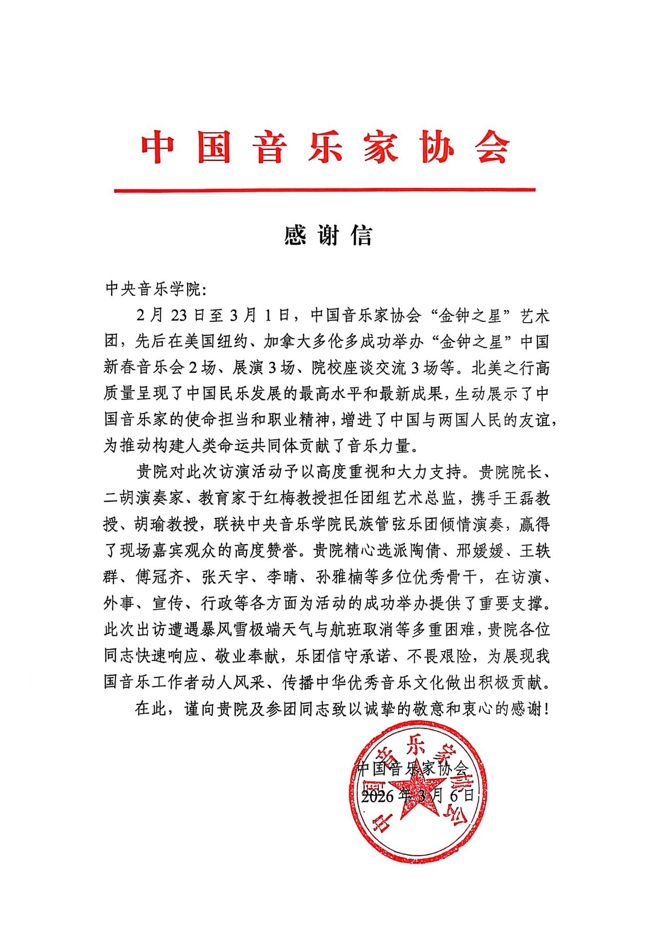 近日,中国音乐家协会向中央音乐学院发来感谢信,对学校在2026年2月23日至3月1日赴美国、加拿大开展文化交流活动期间,全力支持并参与“金钟之星”艺术团相关工作所作出的重要贡献,表示高度认可与衷心感谢。