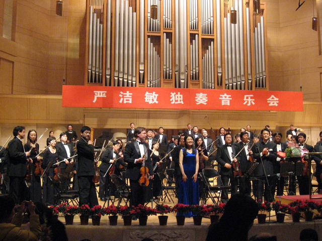 2007年12月10日晚,薄雾升腾的北京中山公园音乐堂里传出了娓娓弦音,音乐堂里座无虚席、灯火辉煌,宽阔而明亮的舞台上,我院二胡教授严洁敏正与北京交响乐团管弦乐队共同演绎着当代中外作曲家的音乐世界。繁复的技法、音色、韵味融入在作品当中给人以相得益彰又浑然一体的别样感受。曲尽终了,严洁敏教授和谭利华指挥被束束鲜花与阵阵掌声簇拥起来,热烈的气氛驱走了冬夜的寒意。