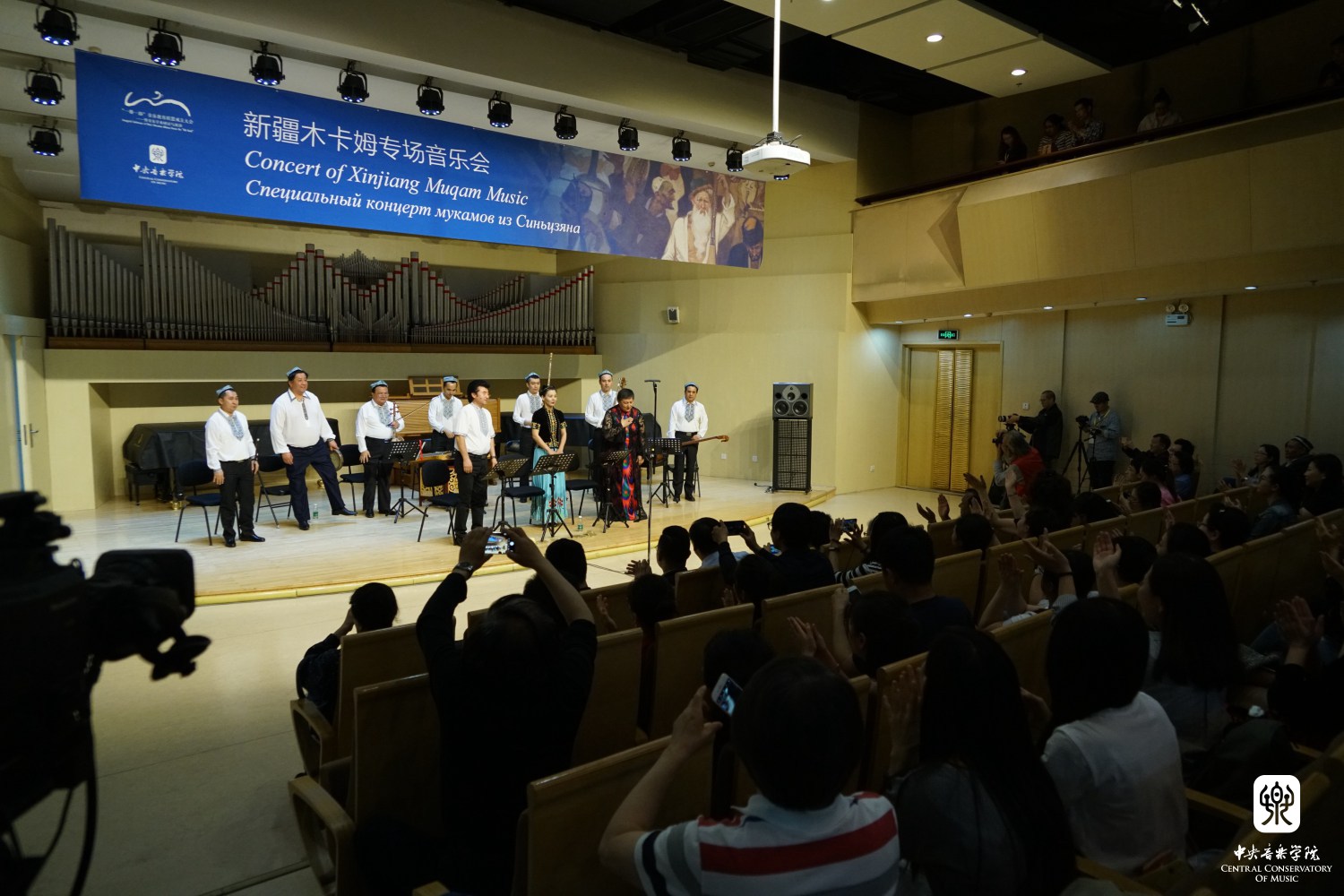 2017年5月6日下午16点30分,中央音乐学院201演奏厅座无虚席, “一带一路音乐教育联盟成立大会——暨音乐学院研讨与展演”活动的第一场专题音乐会 ——“新疆木卡姆专场音乐会”在这里举行。新疆艺术学院中青年教师组成的木卡姆演出团奉献了精彩的演出,给在座观众带来了一场非比寻常的听觉盛宴。中央音乐学院党委书记郭淑兰、中央音乐学院副院长肖学俊、国际传统音乐学会总书记斯文尼博·帕顿、中央音乐学院袁静芳教授、中国音乐学院赵塔里木教授,以及来自15个国家和我国11所音乐院校的院长和专家出席了此次音乐会。音乐会由新疆艺术学院艺术创作实践中心主任、木卡姆与麦西来甫研究方向学术带头人阿不都赛米·阿不都热合曼教授主持。