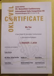2017年11月15日-18日,第7届匈牙利"大卫·波帕尔"国际大提琴比赛在匈牙利皇宫堡隆重举办。我校附中初一学生吴优经过三轮激烈角逐,最终荣获少年组第一名,并参演颁奖音乐会。该成绩是目前国内独立培养的选手在此项国际重大赛事中获得的最好成绩,在此向吴优及指导教师俞佳表示祝贺!