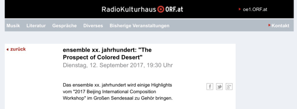 本场音乐会的主题叫做"The Prospect of Colored Desert",由著名指挥家彼得·布维克执棒二十世纪乐团(Ensemble XX Jahrhundert),音乐会于当地时间9月12日在维也纳著名的奥地利广播公司音乐厅(ORF Funkhaus/RadioKulturhaus)举办。