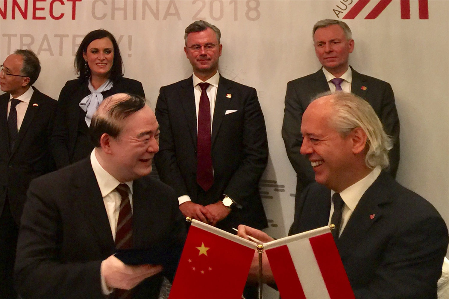 4月8日,总统范德贝伦(Alexander van der Bellen)和总理库尔茨(Chancellor Sebastian Kurz)专程出席了在四季酒店举行的中奥工商及文化教育科技领域代表机构合作协议签署仪式,并共同见证了中央音乐学院俞峰院长和维也纳音乐表演艺术大学克里斯蒂安·迈耶(Christian Meyer)副校长共同签署两校合作协议。