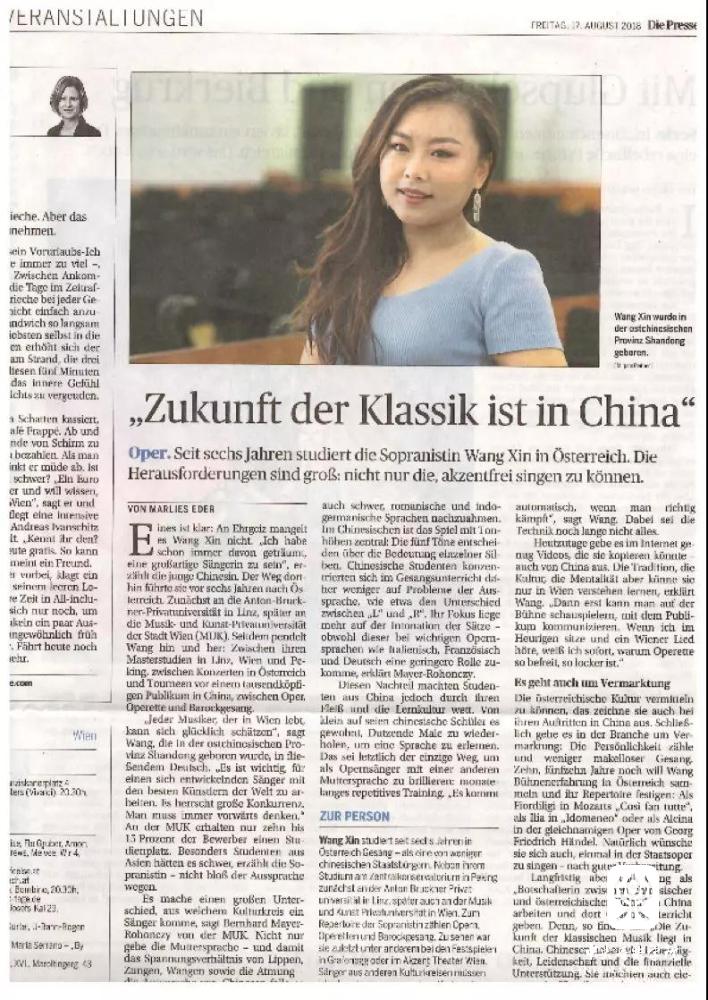 2018年8月17日,奥地利最大通讯社“Die presse”日报社刊登了题为“古典音乐的未来在中国”的报道。报道主要介绍了中国的古典音乐领域在近年取得的飞速进展与巨大发展前景和我校旅奥校友女高音王欣!