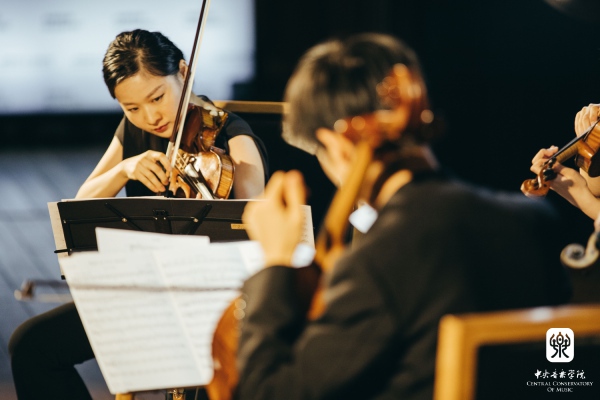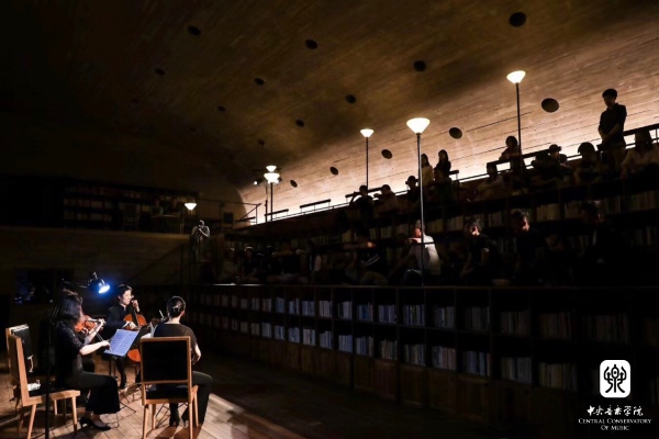 2018年9月7日,我校“琥珀四重奏”(第一小提琴:宁方亮、第二小提琴:苏雅菁、中提琴:戚望、大提琴:杨一晨)受邀在秦皇岛·孤独图书馆,为数十位商业领域代表(总裁或创始人)举办音乐公开课。这场音乐活动不拘一格,通过精湛的演奏与幽默的讲座,让观众在公共图书馆近距离的感受弦乐四重奏深刻的艺术世界,引领社会审美,获得强烈反响。