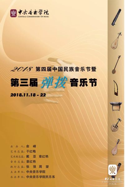 中央音乐学院第三届弹拨音乐节将于11月18至22日举行。音乐节创办于2013年,是中央音乐学院中国民族音乐节系列的重要组成部分。前两届弹拨音乐节先后展示了中央音乐学院弹拨教研一室(琵琶、三弦、阮、柳琴)和二室(筝、扬琴、古琴、箜篌)的演奏、教学、创作和理论成果,本届则是在前两届的经验和成果基础上,集两个教研室之群力,以7场学术讲座、1场专家对话、5场综合音乐会、3场专场音乐会、1场民间音乐展演的规模,广角式展现中央音乐学院八大弹拨专业的学术和艺术全景。