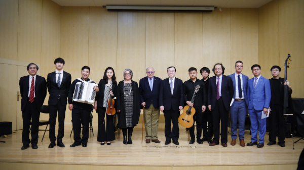 最后,俞峰院长还为盖铁戈大使和托尔鲁奇校长准备了一场特殊的欢迎音乐会。音乐会上,中央音乐学院和合室内乐团演奏了三首探戈作品,其中一首是皮亚佐拉的代表作《角鲨》,另外两首是由中国作曲家创作的中国探戈,一首是陈欣若老师作曲的《探个够》,一首李勇敏先生作曲的《花之探戈》,两首作品非常完美地将中阿两国不同地域文化进行巧妙地融合,形成具有中国特色的探戈作品,令人回味,也让盖铁戈大使和托尔鲁奇校长为之感动。