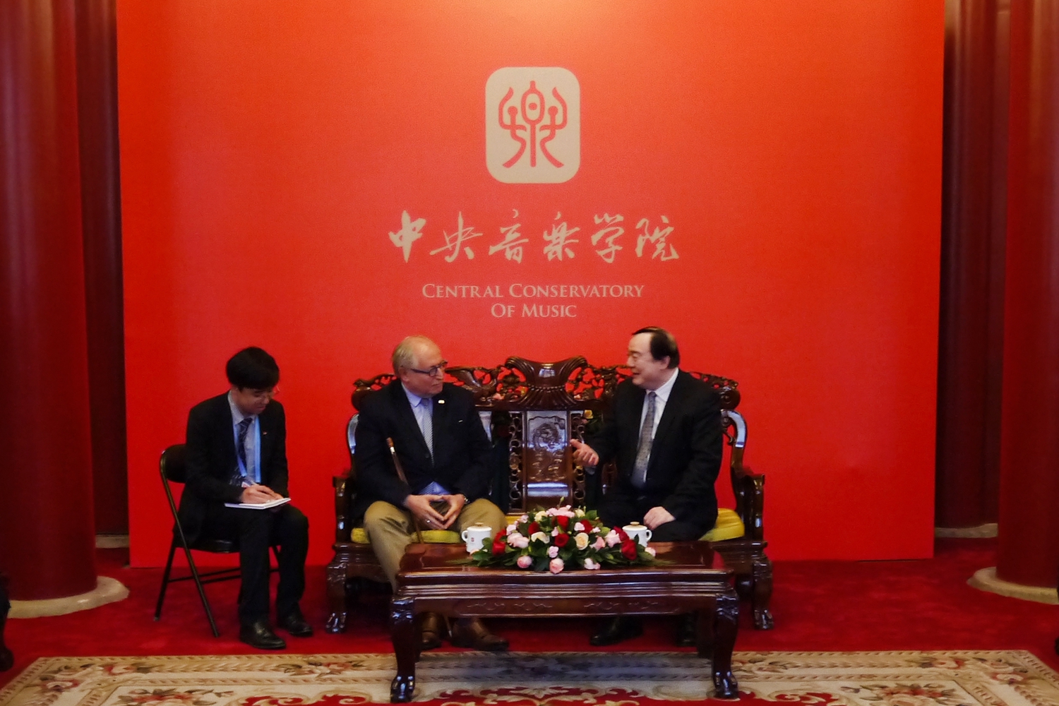 在第二届“一带一路”国际合作高峰论坛召开之际,俞峰院长于4月26日下午在中央音乐学院南大殿迎接阿根廷共和国驻华大使盖铁戈博士和专程前来北京出席第二届“一带一路”音乐教育联盟大会的阿根廷国立艺术大学校长桑德拉·托尔鲁奇教授的到访。