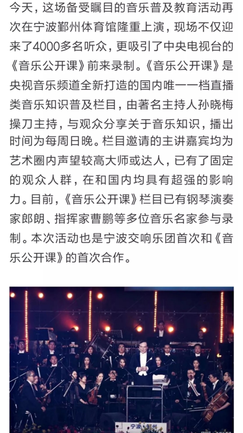 公开课由俞峰院长指挥宁波交响乐团浓情开讲。公开课分为“中国经典”、“音乐课堂”和“音乐的爱国主义”三个篇章,邀请中央音乐学院声乐歌剧系王威、许昌、孙媛媛,中央音乐学院民族室内乐团于源春等艺术家共同出演。
