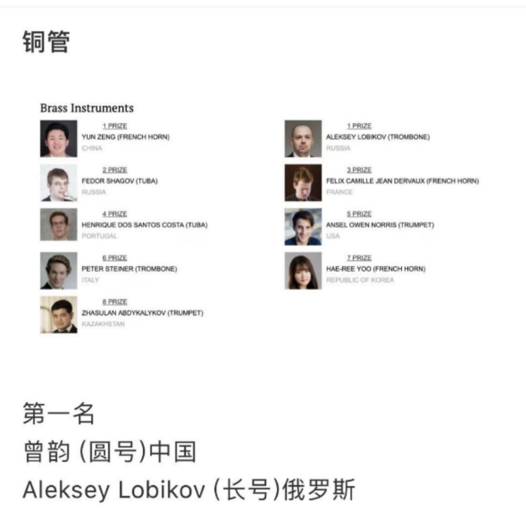 在刚刚结束的第十六届柴可夫斯基国际音乐比赛中,我校管弦系本科二年级曾韵同学凭借出色的演奏和完美的音乐表现获得评委们极高的认可,最终获得铜管组别第一名,再次刷新了中国管乐的历史!指导教师温泉教授。