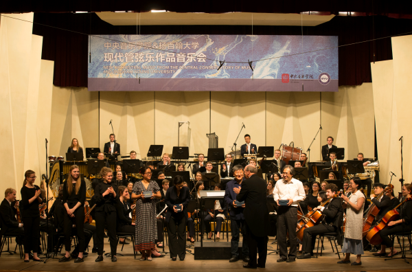 “大协奏曲”是巴洛克时期最重要的协奏曲体裁,我校陈欣若副教授2017年的新作《大协奏曲》遵循这一古老的形式特征,选取西洋乐器组和中国乐器组形成该体裁着意凸显的相互协奏、交替竞争的互动关系。作曲家以“西洋曲体为本、中西合壁为用”的巧妙构思带给美国音乐家们全新的听觉体验,而中国乐器的独特音质与西洋乐器的搭配,在以我校民族室内乐团为主体的演奏家们的手下更是幻化出无比精湛的舞台魅力。