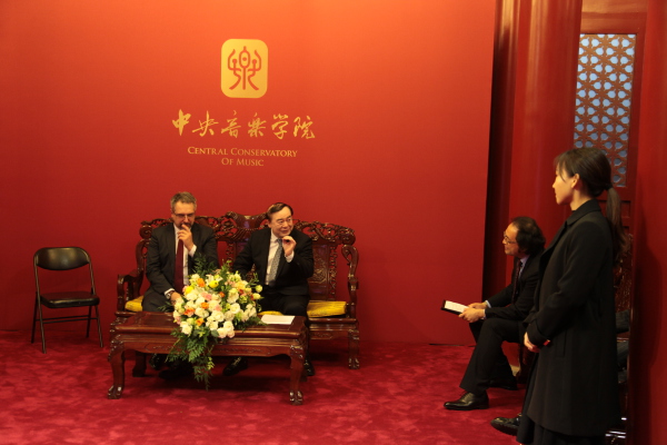 揭牌仪式前,中央音乐学院俞峰院长与专程来访的华沙肖邦音乐大学校长巴兰先生进行了友好会谈。俞院长对巴兰先生表示了亲切的问候,希望双方继续加强合作,进一步多渠道、多形式、多层次地拓展各种友好交流。巴兰校长感谢中央音乐学院的热情接待,将努力把双方领导高层互访所确立的举行学术活动及交换生等合作共识逐步转化为现实,为两大音乐学府的全面深度合作奠定坚实的基础。揭牌仪式由中央音乐学院钢琴系党支部书记、系副主任曹晓青教授主持。中央音乐学院国际交流处陶倩处长,宣传部刘红柱部长、钢琴系副主任韦丹文教授和“第二届北京肖邦国际青少年钢琴比赛”组委会执行艺术总监吴迎教授等同时参加了本次揭牌活动。