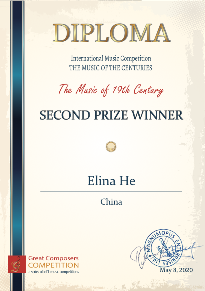 在刚刚过去的五月,第五届英国“世纪杰出作曲家”国际音乐演奏比赛(Great Composers Competition—a series of Int’l Music Competition)落下帷幕,中央音乐学院附小五年级学生何泽雨(Elina He)获得19世纪音乐演奏奖第二名。指导教师:刘霄教授。