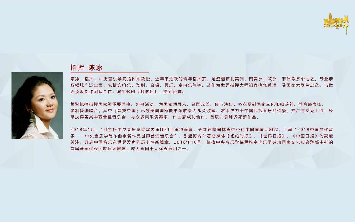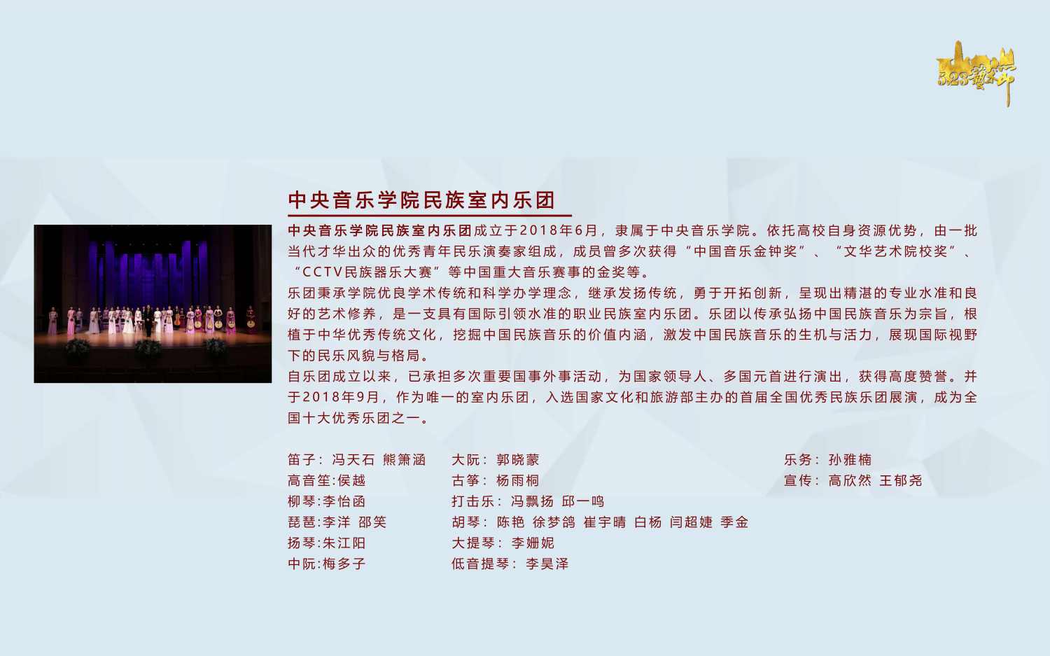 本场音乐会展示了中央音乐学院民族音乐优异的教学成果,呈现出当今全国民乐演奏的最高水准。有中央音乐学院师生在2019年中央广播电视总台举办的民族器乐电视大赛荣获金奖的精彩演奏,也有中央音乐学院民族室内乐团和圣风室内乐团两支曾获得全国民族室内乐、民乐组合最高奖的优秀乐团的倾情奉献,还有中央音乐学院副院长于红梅教授献礼延安听众的两首经典乐曲,将为观众们送上一台精彩纷呈的民乐盛宴。