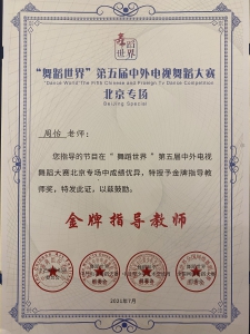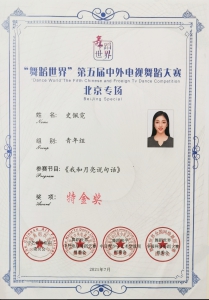 2021年7月4日,CCTV舞蹈世界第五届中外电视舞蹈大赛北京专场大幕拉开,竞演当天共103个节目参演,经过激烈的角逐,经由评委老师现场打分评选出铜奖、银奖、金奖以及特金奖作品,由我校人文学部青年舞蹈教师周怡指导的音乐教育学院温珈绮同学的《爱莲说》和史佩霓同学的《我和月亮说句话》凭借出色的表演征服了现场评委,最终包揽青年组的两项特金奖。周怡获金牌教师指导奖。