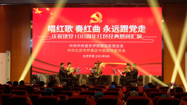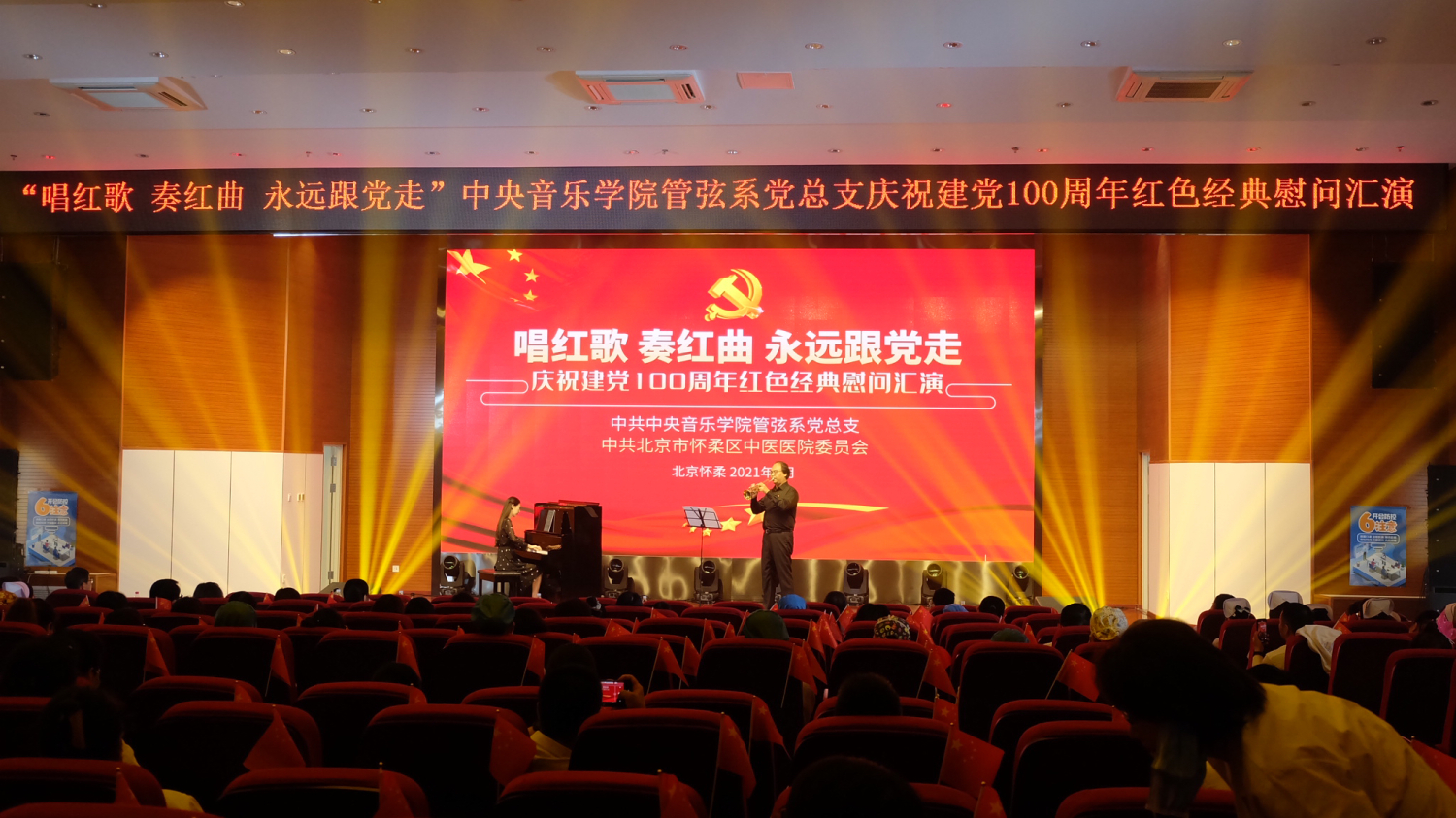 6月17日,为庆祝建党100周年,传承红色基因,由中央音乐学院管弦系党总支、怀柔区中医医院党委联合举办的“唱红歌、奏红曲、永远跟党走”主题党日活动在怀柔区中医医院举行。管弦系党总支书记陈光教授、教师党支部书记尹一迦副教授及部分师生代表与怀柔区中医医院党委书记刘宝珍及医院班子成员、党支部书记部分代表进行座谈,并和医院医护人员联合带来红色经典慰问汇演。