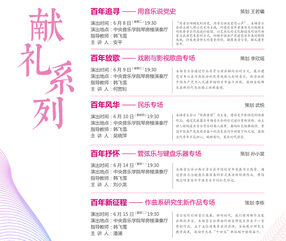 “献礼”系列通过五场音乐会的展示,抒发央音师生凝聚青春力量,献礼建党百年,以昂扬的步伐迈向“十四五”、迈向新征程的爱国爱党情怀。“百年追寻 —— 用音乐说党史”通过对建党百年重要历史时期相关优秀音乐作品的梳理,以艺术化的文化解读,以及对话作曲家与表演艺术家的方式,回顾中国共产党建党百年来的辉煌成就;“百年放歌 —— 戏剧与影视歌曲专场”通过作品导赏与演出相结合的方式,展示建党百年以来耳熟能详的优秀戏剧与影视音乐,热情讴歌中国共产党为人民谋幸福的百年奋斗历程;“百年风华 —— 民乐专场”以“经典重塑”为主旨,将历史中歌颂党的经典音乐作品,通过民族器乐专场音乐会的形式进行重新演绎,由主讲人娓娓道出音乐背后的感人故事,重温中国共产党在历史长河中留下的艰苦奋斗的足迹;“百年抒怀 —— 管弦乐与键盘乐器专场”以西方音乐在中国的百年发展为主线索,通过管弦乐与键盘乐器演奏的形式来演绎经典作品,带领观众回首百年中国音乐中的红色印记;“百年新征程 —— 作曲系研究生新作品专场”通过五十五位演奏员演绎作曲系研究生带来的十一首新作品,旨在激励青年学生在“十四五”新征程中继续奋斗。