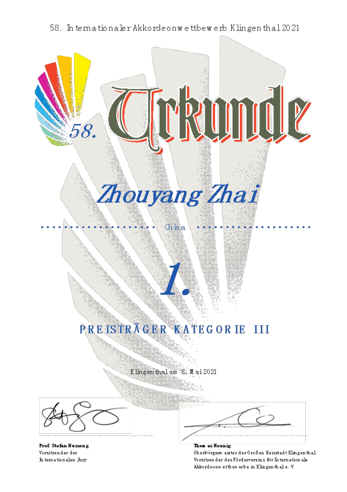 2021年5月2日至8日,第58届德国克林根塔尔国际手风琴比赛 (58th International Accordion Competition Klingenthal)于线上隆重举行,经过激烈角逐,我校钢琴系博士二年级学生田佳男获得独奏家组第一名;附中高二学生翟周洋、张乃心分别获得青年组第一、第二名。