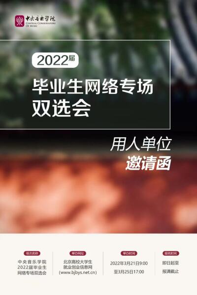 衷心感谢各用人单位多年来对于中央音乐学院就业工作的关心和支持!为贯彻党中央、国务院"稳就业"、"保就业"的决策部署,根据教育部和北京市教委对北京高校毕业生就业工作的相关要求,促进高校毕业生更加充分更高质量就业,中央音乐学院与北京高校大学生就业创业指导中心将联合举办"BJBYS成功就业"-中央音乐学院2022届毕业生网络专场双选会"。中央音乐学院愿积极搭建选聘平台,诚邀广大用人单位选聘毕业生,参与就业招聘活动!