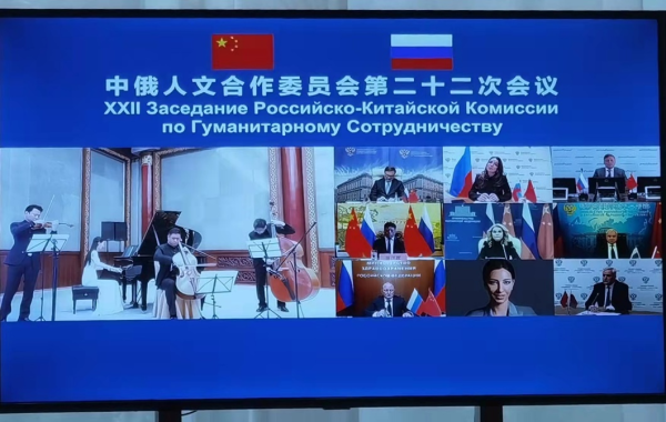 中俄人文合作委员会第二十二次会议于2021年11月16日在北京钓鱼台国宾馆以视频连线方式召开。中国国务院副总理和俄罗斯副总理,两国教育、文化、外交、卫生、广电、体育、档案和电影等相关领域的部委领导出席了会议。中央音乐学院校长俞峰教授和国际交流处处长陶倩应邀参加了会议。