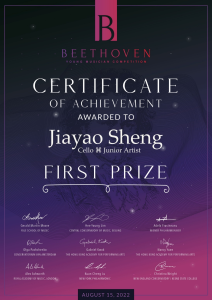 2022年贝多芬国际青年音乐家比赛(BEETHOVEN YOUNG MUSICIAN COMPETITION),大提琴少年艺术家组一等奖。