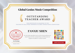 全球天才音乐家大奖赛(Global Genius Music Competition )旨在发现世界最有前途的古典音乐家,此次比赛由总部设在英国米尔顿凯恩斯全球委员会举办,评审团成员由克罗地亚萨格勒布音乐学院;土耳其阿纳多卢国家音乐学院;意大利安东尼奥维瓦尔第音乐学院;美国雪兰多艺术学院;西班牙马德里皇家音乐学院;美国罗德岛大学;英国市政厅音乐戏剧学院等教授组成。2022年春季赛季共有529名键盘选手参赛。